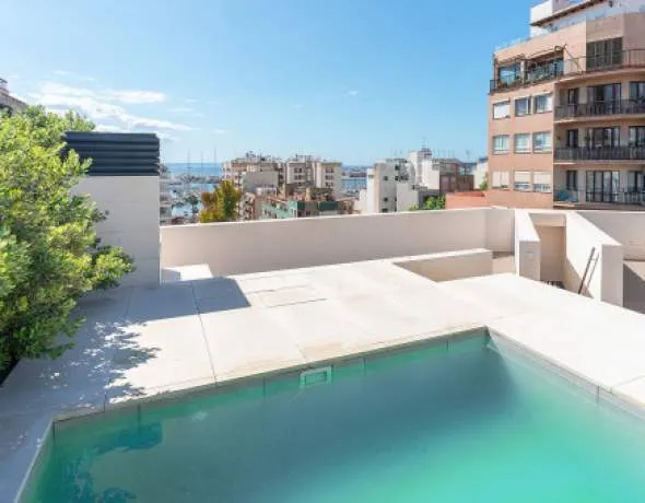 Details: Located in the immediate vicinity of the Palma Tennis Club and in the popular Santa Catalina district, this property boasts an excellent micro-location. Restaurants, cafés, shops and the weekly market are all within walking distance, as is the nearby harbor promenade, which perfectly underlines the Mediterranean lifestyle of this location. A special highlight is the spacious 95 sqm roof terrace with private plunge pool and stylish lounge area. From here you can enjoy a beautiful, open view over Santa Catalina as far as the Palma Tennis Club and the harbor - an ideal place to spend relaxing hours or enjoy the sunset in an exclusive ambience. The modern penthouse has a constructed interior area of 97 sqm and impresses with its well thought-out room layout. It offers 3 bedrooms with fitted wardrobes and 2 bathrooms, one of which is en suite. The open-plan living and dining area with fully equipped kitchen forms the heart of the apartment and offers direct access to the terrace. From here, a staircase leads up to the private roof terrace. The high-quality fittings include air conditioning with an air heat pump, underfloor heating and an elevator for convenient access. A private pool on the roof terrace, a communal pool, 2 underground parking spaces and a storage room round off this attractive offer perfectly. Location & surrounding area: The district of Santa Catalina is one of the typical zones of "Ciudad de Palma", home to the famous "Mercat de Santa Catalina", which still retains the flavor of traditional markets where you can buy typical products of the Majorcan countryside and Mediterranean Sea. Originally a fishing district because of its proximity to the sea, the typical dwellings of 1 or 2 floors have been conserved with their balconies and façades with Majorcan shutters and urban morphology that is carefully preserved. Among the inhabitants of Santa Catalina you can find people from all around the world in bars out in the sun, shopping in the market or buying in the street, as well as people who have chosen to live in the town, bringing their culture and giving the neighborhood a touch of class and elegance. With regard to the gastronomic and leisure offer, the town is one the most generous of the island, and in the happy streets you will find the greatest variety of bars and restaurants from the simple and typical of the neighborhood to cutting edge and sophisticated.
