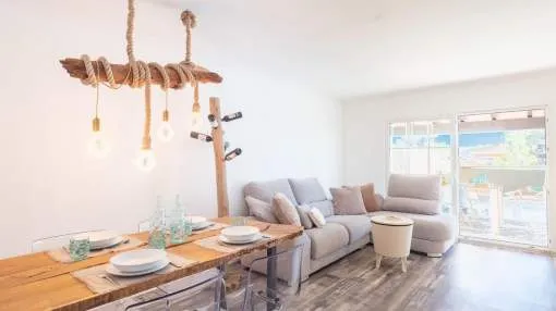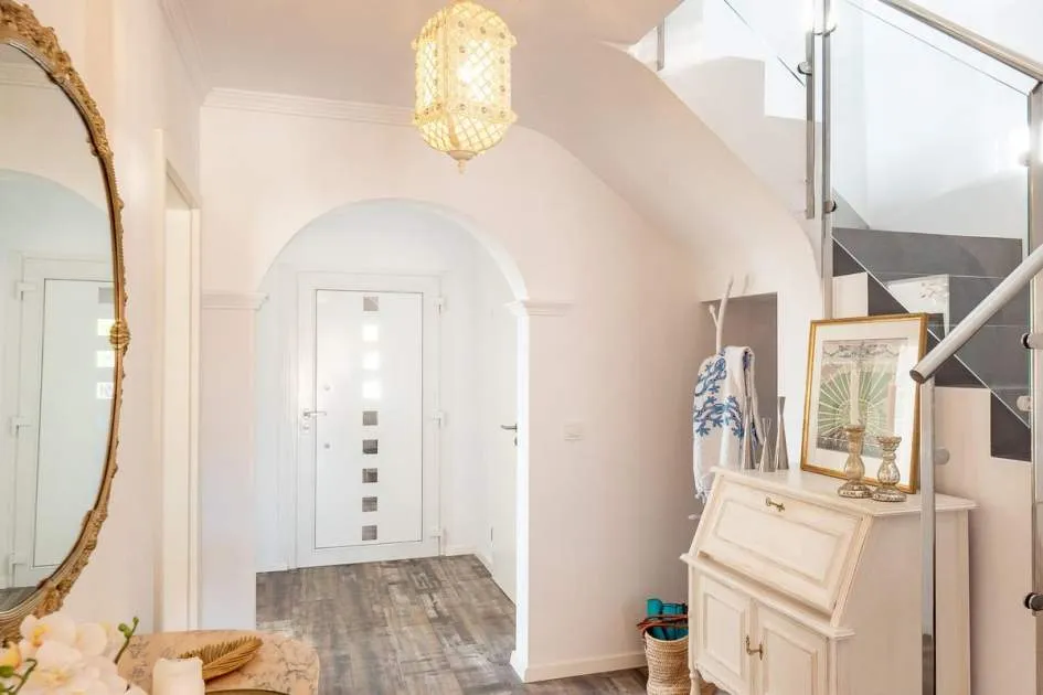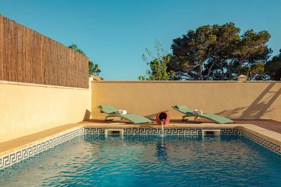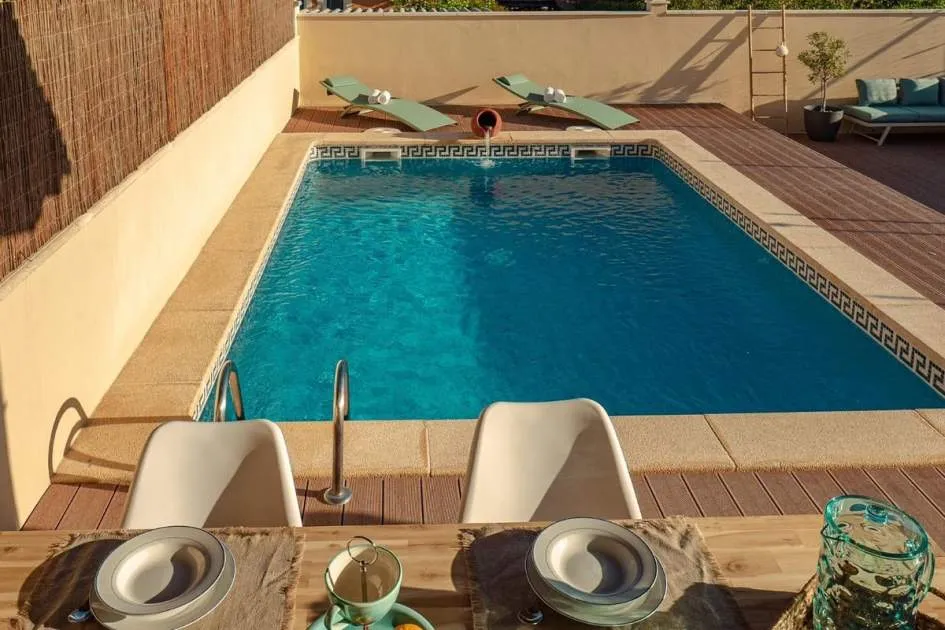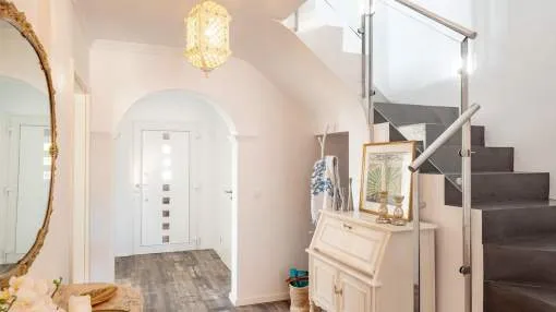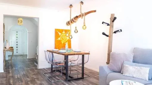 Diese charmante Doppelhaushälfte in Badia Gran überzeugt durch zeitgemäße Austattungsmerkmale und eine idyllische Lage mit beeindruckendem Meerblick. Auf zwei Ebenen erstreckt sich die ca. 134 qm Wohnfläche mit durchdachter Raumaufteilung, die Komfort und stilvolles Wohnen perfekt vereint. Im Erdgeschoss befinden sich der helle Eingangsbereich, ein gemütliches Schlafzimmer, ein modernes Badezimmer, das gleichzeitig als praktische Gästetoilette dient, sowie das Wohn-/Esszimmer und die vollständig renovierte Einbauküche, die mit erstklassigen Elektrogeräten ausgestattet ist. Der großzügige Wohn- und Essbereich öffnet sich nahtlos zu einer eleganten Teakholzterrasse, die direkt in den Außenbereich mit Pool führt. Hier lädt eine große Terrasse zum Entspannen ein. Im Obergeschoss dagegen warten zwei stilvolle Doppelschlafzimmerund ein voll ausgestattetes Bad, da sich beide Yimmer teilen. Zwei Balkone bieten einen ruhigen Rückzugsort mit freiem Blick auf das Meer und lassen das Herz von Naturliebhabern höherschlagen. Das gesamte Haus wurde umfassend renoviert und bietet modernen Wohnkomfort: Hochwertige, doppelt verglaste PVC-Fenster, Heizung und Klimaanlage in allen Räumen sorgen für wohlige Wärme im Winter und angenehme Kühle im Sommer.