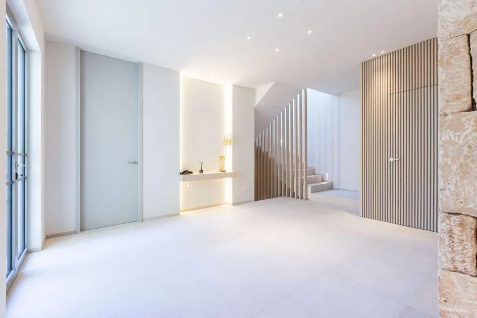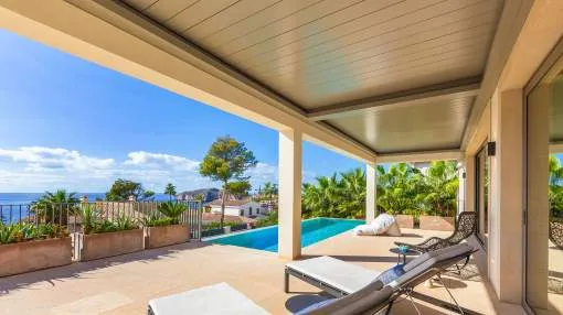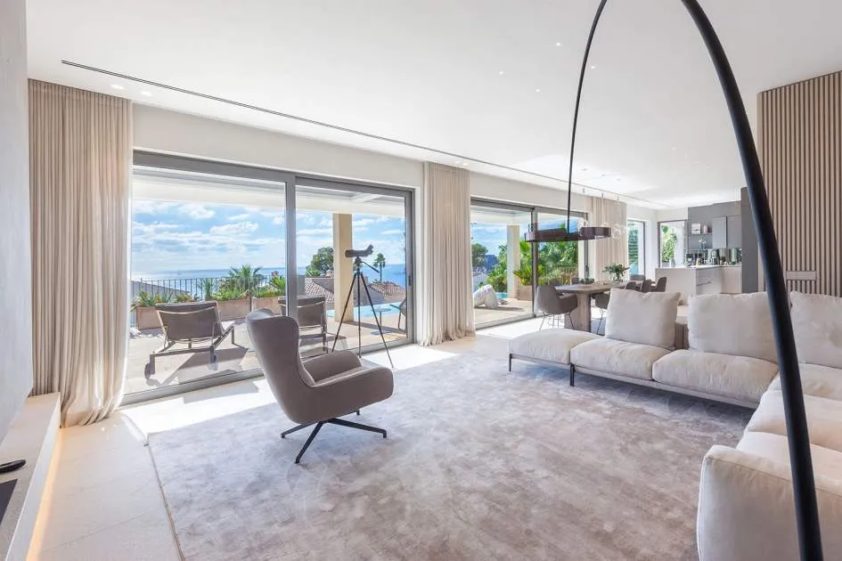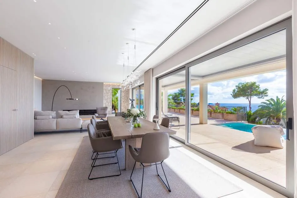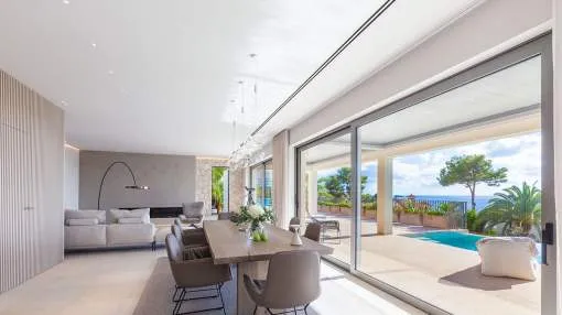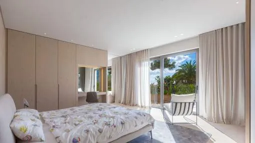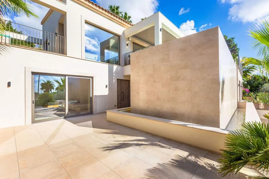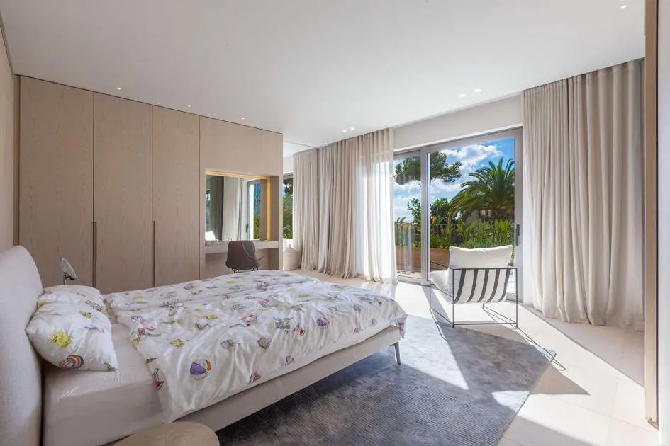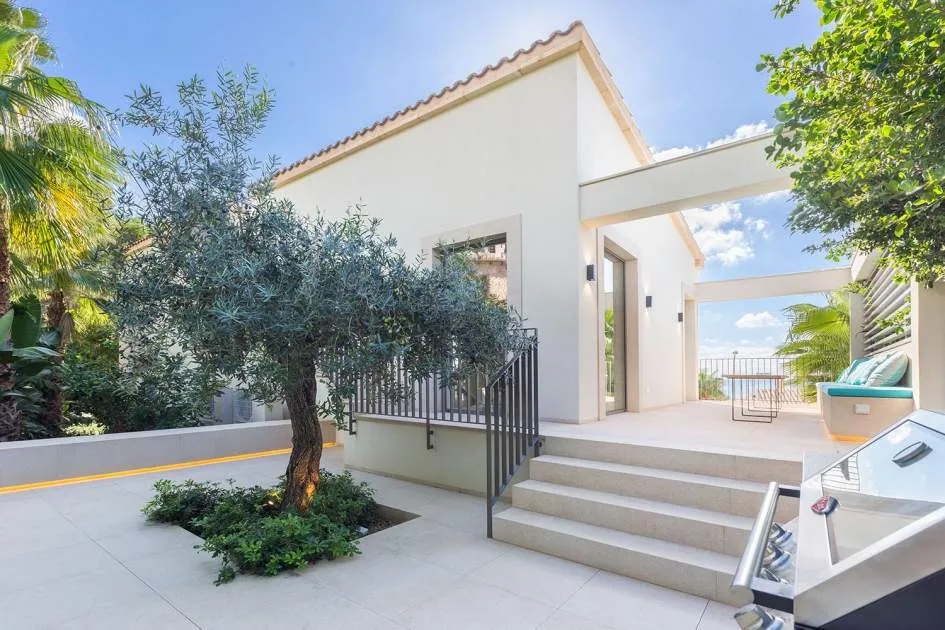 In ruhiger Wohnlage nahe dem Ortszentrum und nur eine kurze Autofahrt von den Stränden, Golfplätzen und Yachthäfen der Region entfernt befindet sich diese exzellente Villa mit Südwestorientierung. Nur wenige Schritte vom Meer entfernt genießt man die Exklusivität einer der begehrtesten Villenurbanisationen Santa Ponsas und die vorhandene umfangreiche Infrastruktur des Südwestens der Insel. Palma und der Flughafen sind 25 – 30 Autominuten entfernt. Das Haus überzeugt mit Licht erfüllten Räumen sowie einer hochwertigen und stilvollen Ausstattung. Die Hauptwohnebene im Obergeschoss teilt sich auf in das Wohn-/ Esszimmer mit offener Markenküche und Zugang zur herrlichen Poolterrasse mit Lounge-Area, einer Sommerküche und fantastischem Meer- und Panoramablick. Hinzu kommt eine Gästetoilette. Das Masterschlafzimmer mit Ankleide und Bad, drei weitere Schlafzimmer mit Bäder en suite befinden sich auf der Eingangsebene im Erdgeschoß. In der unteren Etage stehen ein Schlafzimmer mit Bad, ein Fitnessraum mit Sauna und Bad, eine Bodega, ein Wirtschaftsraum sowie ein Abstell- und Technikraum und eine Doppelgarage zur Verfügung. Alle Ebenen sind per Lift verbunden.