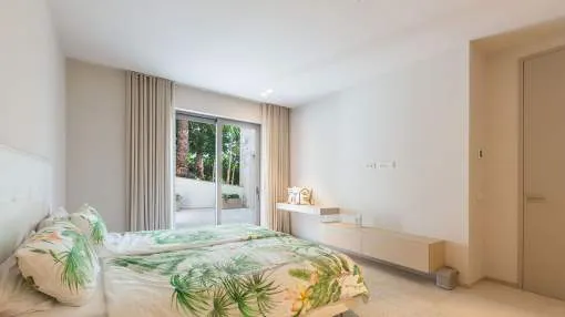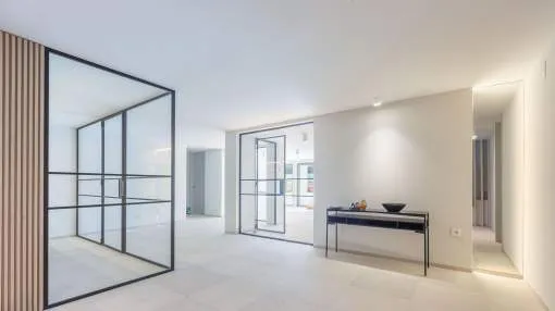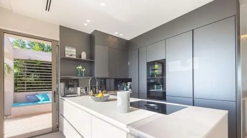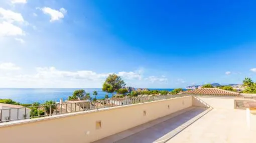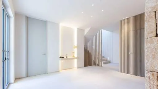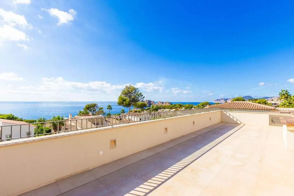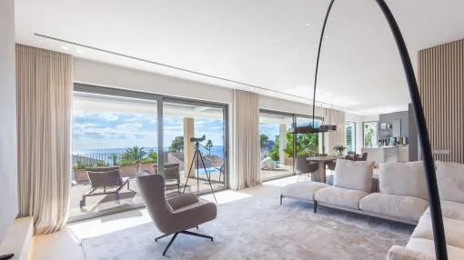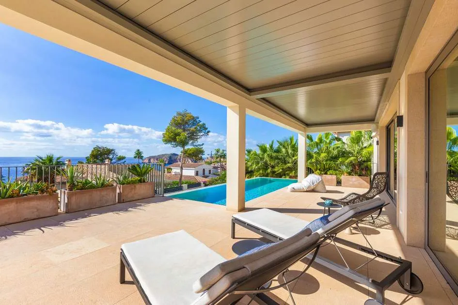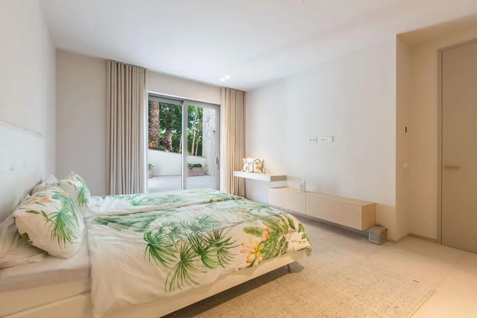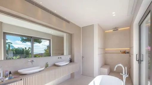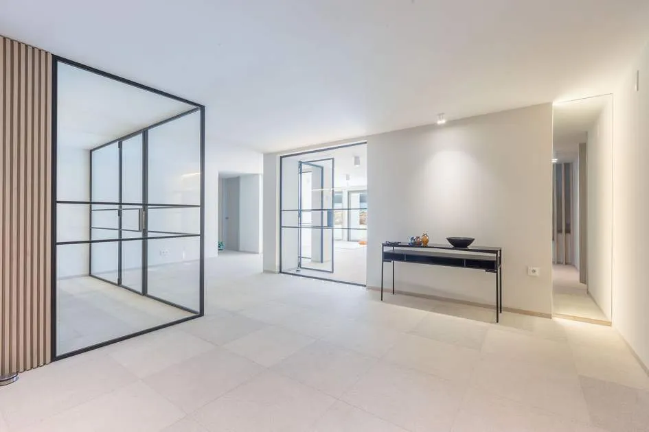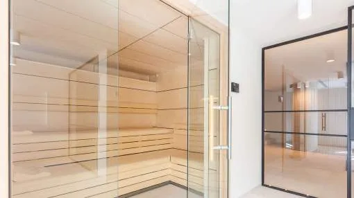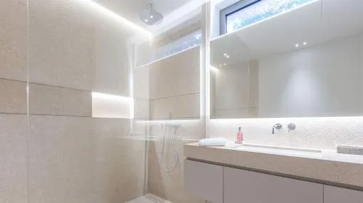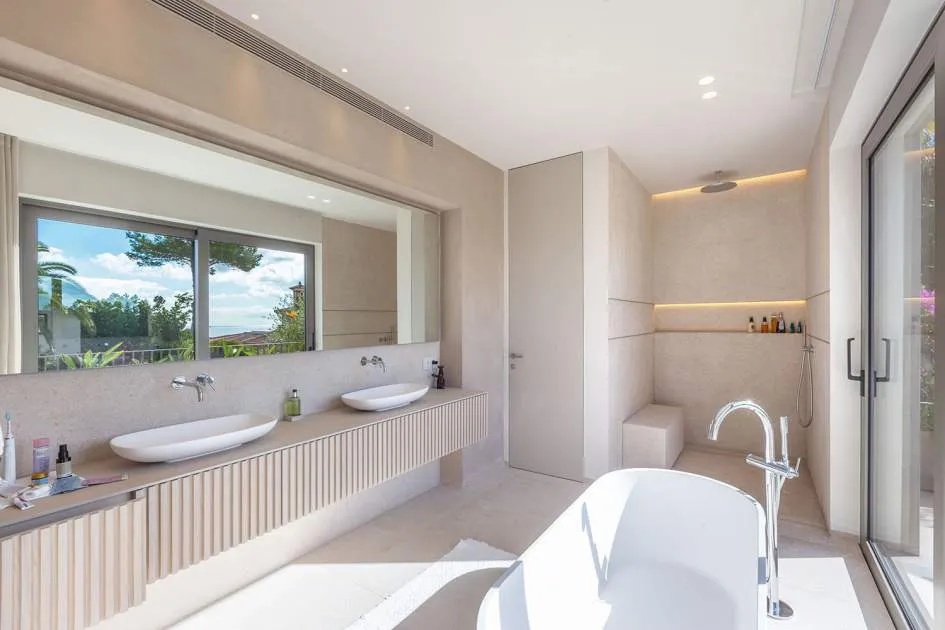In ruhiger Wohnlage nahe dem Ortszentrum und nur eine kurze Autofahrt von den Stränden, Golfplätzen und Yachthäfen der Region entfernt befindet sich diese exzellente Villa mit Südwestorientierung. Nur wenige Schritte vom Meer entfernt genießt man die Exklusivität einer der begehrtesten Villenurbanisationen Santa Ponsas und die vorhandene umfangreiche Infrastruktur des Südwestens der Insel. Palma und der Flughafen sind 25 – 30 Autominuten entfernt. Das Haus überzeugt mit Licht erfüllten Räumen sowie einer hochwertigen und stilvollen Ausstattung. Die Hauptwohnebene im Obergeschoss teilt sich auf in das Wohn-/ Esszimmer mit offener Markenküche und Zugang zur herrlichen Poolterrasse mit Lounge-Area, einer Sommerküche und fantastischem Meer- und Panoramablick. Hinzu kommt eine Gästetoilette. Das Masterschlafzimmer mit Ankleide und Bad, drei weitere Schlafzimmer mit Bäder en suite befinden sich auf der Eingangsebene im Erdgeschoß. In der unteren Etage stehen ein Schlafzimmer mit Bad, ein Fitnessraum mit Sauna und Bad, eine Bodega, ein Wirtschaftsraum sowie ein Abstell- und Technikraum und eine Doppelgarage zur Verfügung. Alle Ebenen sind per Lift verbunden.