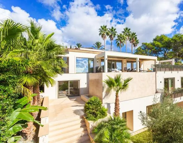In ruhiger Wohnlage nahe dem Ortszentrum und nur eine kurze Autofahrt von den Stränden, Golfplätzen und Yachthäfen der Region entfernt befindet sich diese exzellente Villa mit Südwestorientierung. Nur wenige Schritte vom Meer entfernt genießt man die Exklusivität einer der begehrtesten Villenurbanisationen Santa Ponsas und die vorhandene umfangreiche Infrastruktur des Südwestens der Insel. Palma und der Flughafen sind 25 – 30 Autominuten entfernt. Das Haus überzeugt mit Licht erfüllten Räumen sowie einer hochwertigen und stilvollen Ausstattung. Die Hauptwohnebene im Obergeschoss teilt sich auf in das Wohn-/ Esszimmer mit offener Markenküche und Zugang zur herrlichen Poolterrasse mit Lounge-Area, einer Sommerküche und fantastischem Meer- und Panoramablick. Hinzu kommt eine Gästetoilette. Das Masterschlafzimmer mit Ankleide und Bad, drei weitere Schlafzimmer mit Bäder en suite befinden sich auf der Eingangsebene im Erdgeschoß. In der unteren Etage stehen ein Schlafzimmer mit Bad, ein Fitnessraum mit Sauna und Bad, eine Bodega, ein Wirtschaftsraum sowie ein Abstell- und Technikraum und eine Doppelgarage zur Verfügung. Alle Ebenen sind per Lift verbunden.