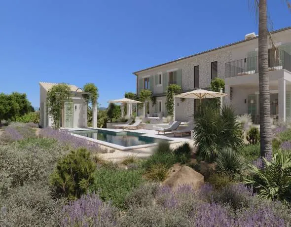 Zwischen den Weinbergen von Sencelles entsteht dieses außergewöhnliche Fincaanwesen, das moderne Architektur mit mallorquinischer Authentizität verbindet. Naturstein, warme Holzelemente und ausgewählte Materialien schaffen eine Atmosphäre zeitloser Eleganz. Der Panoramablick erstreckt sich über die eigenen Reben bis zur Tramuntana und zur historischen Dorfkirche. Das Anwesen wird von traditionellen Trockensteinmauern und einem liebevoll angelegten mediterranen Garten eingerahmt; ein alter Olivenbaum am Eingang begrüßt Bewohner und Gäste.
