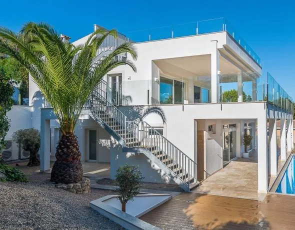 Im Obergeschoss gibt es einen lichtdurchfluteten offenen Wohn- und Essbereich mit einer modernen und sehr eleganten Luxusküche. Große Schiebetüren führen auf eine Terrasse, welche einen fantastischen Blick über die Bucht von Santa Ponsa bietet.