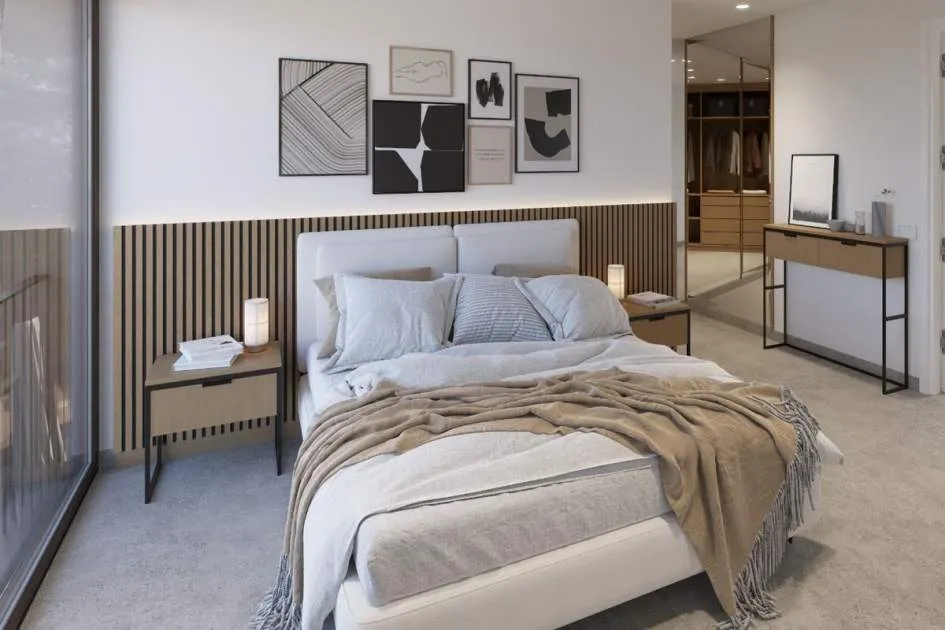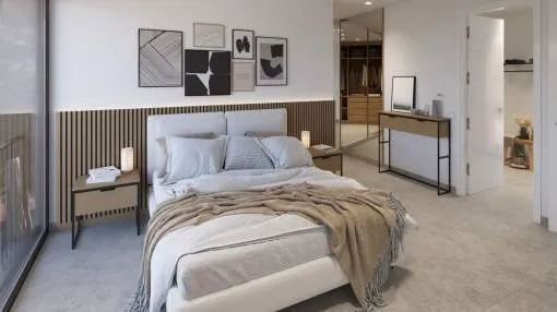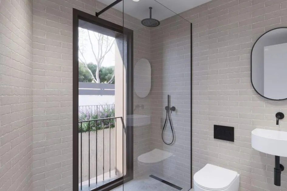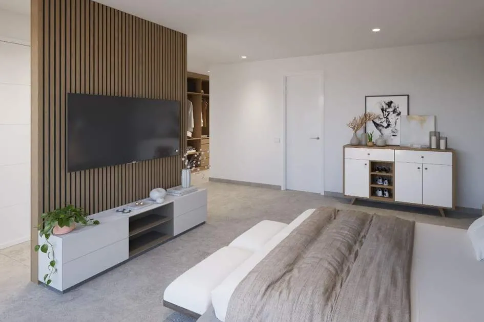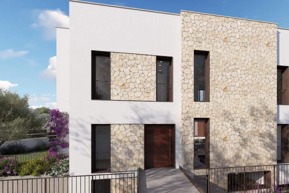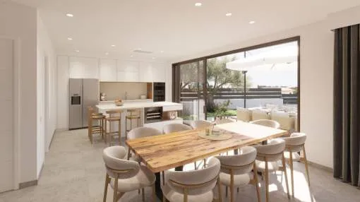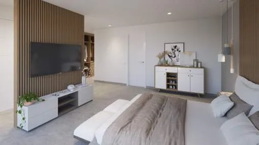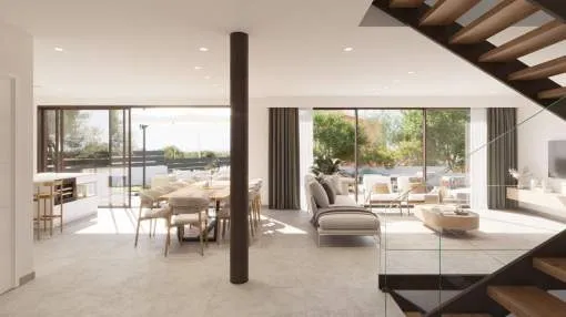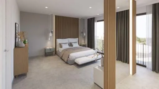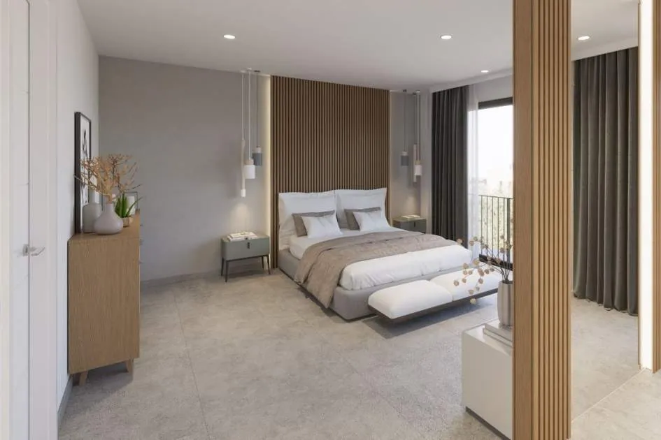 Das Erdgeschoss bietet ein großes Wohn-Esszimmer mit voll ausgestatteter offener Küche, ein Schlafzimmer mit Bad en suite sowie ein Gäste-WC. Im Obergeschoss befinden sich drei Schlafzimmer, alle mit Ankleidezimmer und eigenem Bad, sowie eine Dachterrasse mit Blick auf die Bucht von Palma und das Tramuntana-Gebirge.