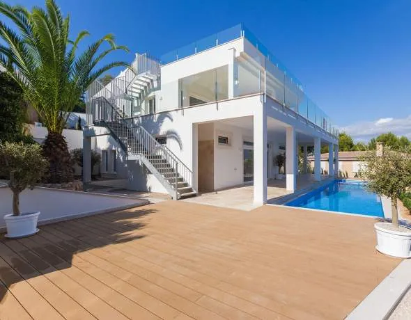 Diese im Jahr 2017 komplett kernsaniert Villa befindet sich in erhöhter Position in einer der begehrtesten Villenwohnlagen des Südwestens und genießt einen wunderbaren Panorama-Meerblick. Der lichtdurchflutete Hauptwohnbereich in der oberen Etage umfasst das Wohn-/ Esszimmer mit amerikanischer Küche und ein Gäste-WC. Das Masterschlafzimmer mit Ankleide, Bad en Suite und zwei weitere Schlafzimmer mit Bädern en Suite befinden sich in der unteren Etage. Des Weiteren steht ein separat zugänglicher Hauswirtschafts- und Technikraum zur Verfügung. Der Außenbereich bietet freie und überdachte Terrassen mit Swimmingpool und Außendusche, eine Dachterrasse mit 360° Rundblick sowie einen pflegeleicht angelegten Garten und PKW-Stellplätze. Die Vorauszahlung einer Jahresmiete ist erforderlich.