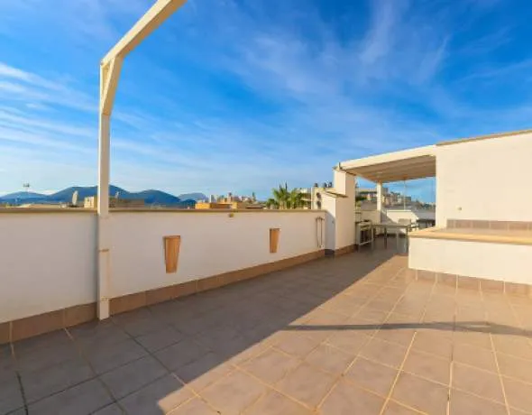 Dieses gepflegte Apartment befindet sich in der dritten Etage eines Wohngebäudes mit Aufzug, direkt am Hafen von Puerto de Alcúdia. Das absolute Highlight ist die großzügige, private Dachterrasse mit stilvoller Lounge-Ecke und einem traumhaften Blick über die Umgebung.