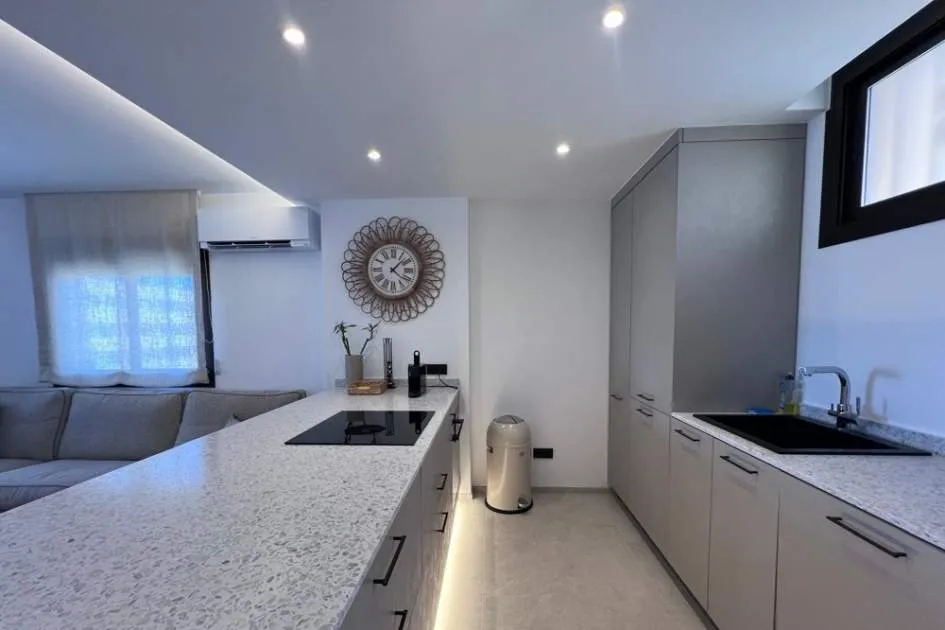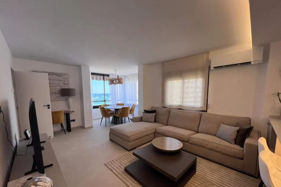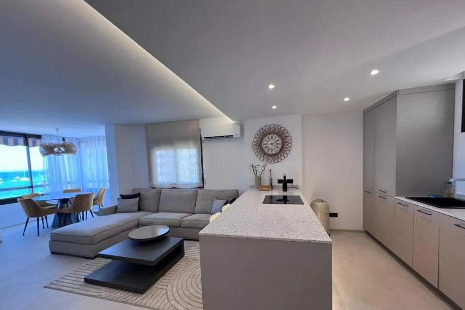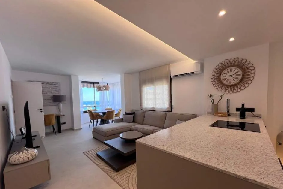 Mit einer Wohnfläche von 70 m² überzeugt diese helle und stilvoll eingerichtete Immobilie mit einem gemütlichen Wohnbereich mit Ecksofa, einer voll ausgestatteten offenen Küche und einer eleganten, verglasten Essecke mit atemberaubendem Meerblick – perfekt für ein Frühstück mit Meeresrauschen.