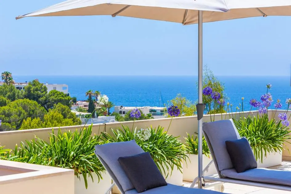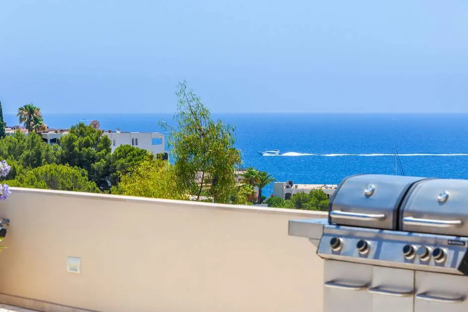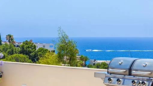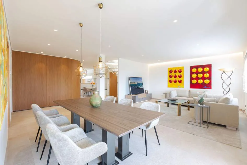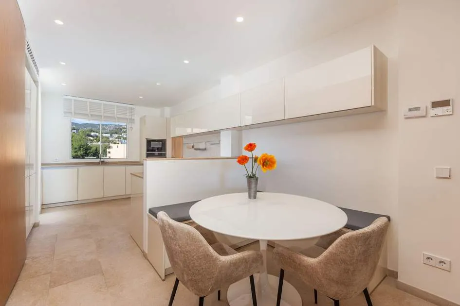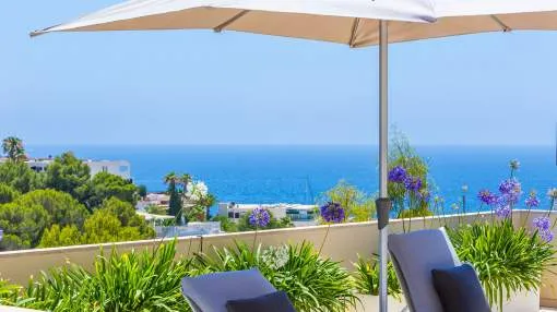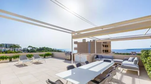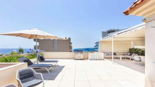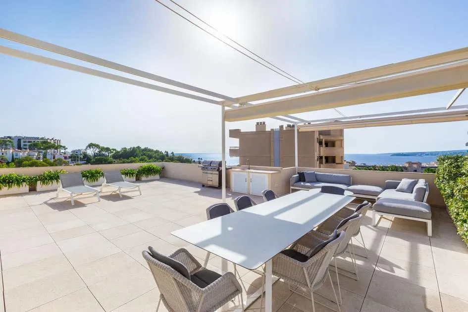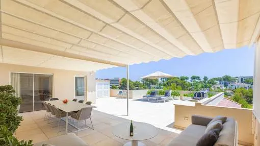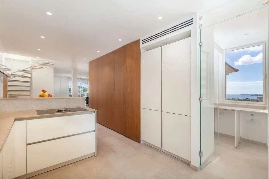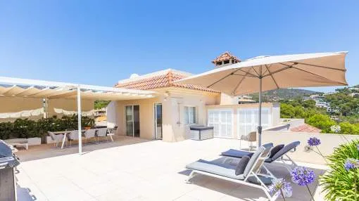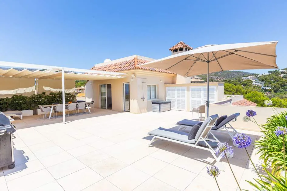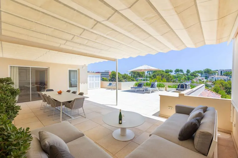 Dieses hochwertig renovierte und elegant ausgestattetes Penthaus befindet sich in einer kleinen Apartmentanlage im mediterranen Stil mit nur sechs Wohneinheiten in zentrumsnaher Wohnlage. Auf kurzem Fußweg erreicht man das Ortszentrum von Portals Nous sowie den exklusiven Hafen Puerto Portals mit angrenzendem Sandstrand. Mehrere Golfplätze, schöne Strände sowie die Küstenorte mit allen Annehmlichkeiten und weitere Yachthäfen des Südwestens sind nur wenige Fahrminuten entfernt. Des Weiteren bietet das luxuriöse Duplex-Apartment eine geräumige überdachte Meerblick-Terrasse auf der Eingangsebene sowie eine 85 m² große Sonnenterrasse mit Pergola, BBQ-Bereich, Lounge, angrenzendem Schlafzimmer mit Ankleide und Bad sowie einem sensationellem Meer- und Panoramablick.