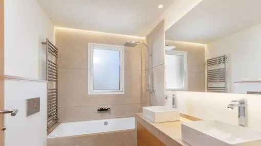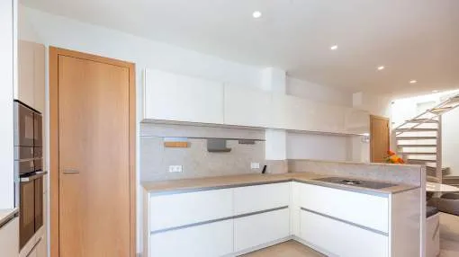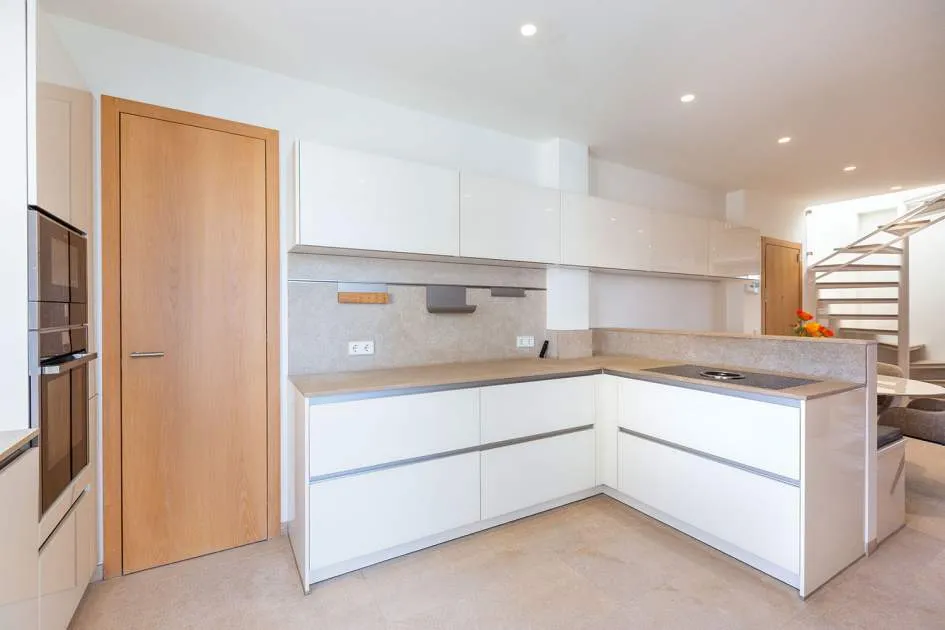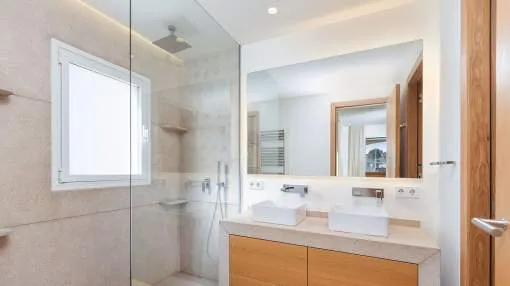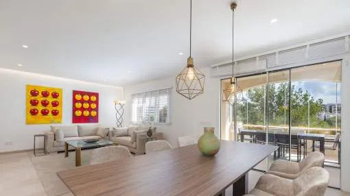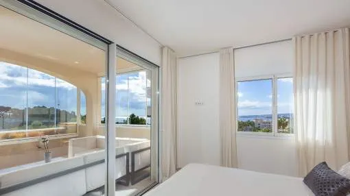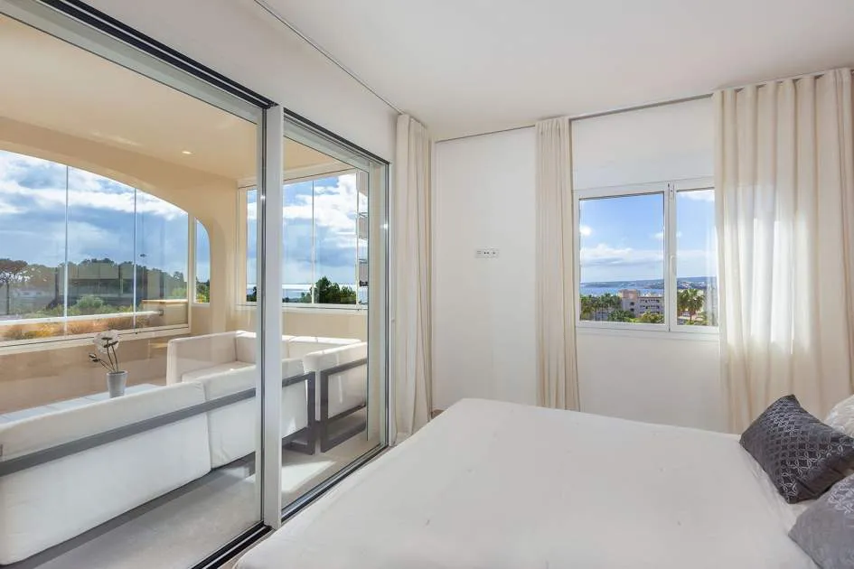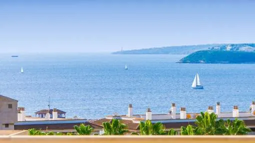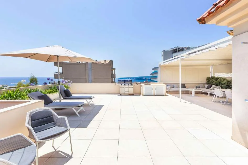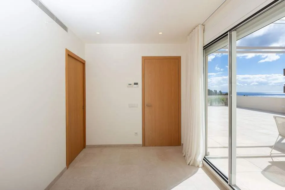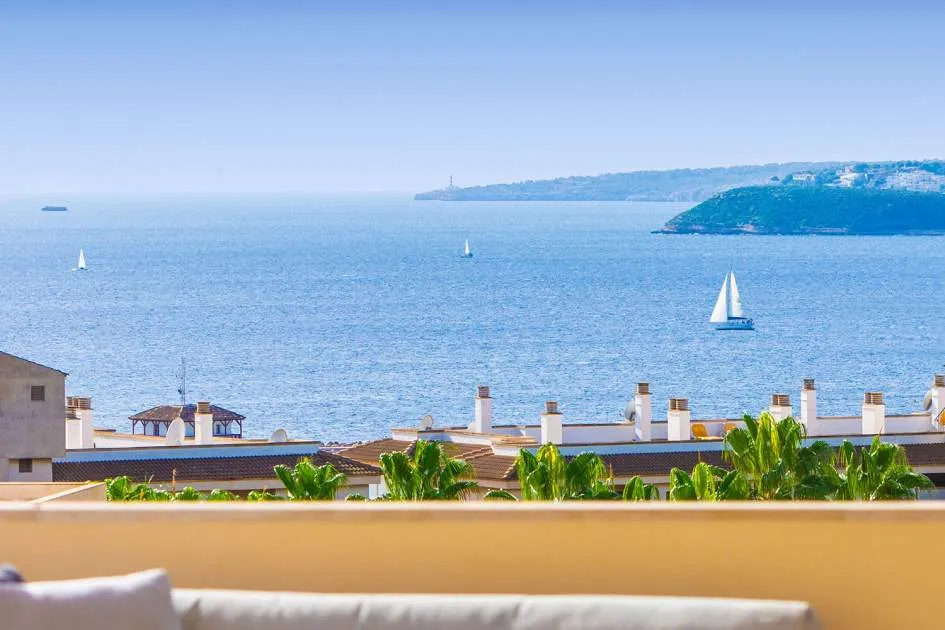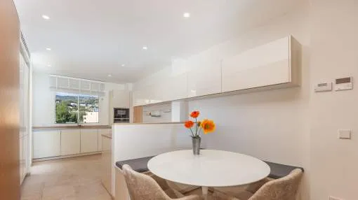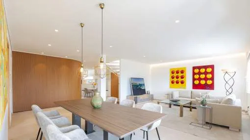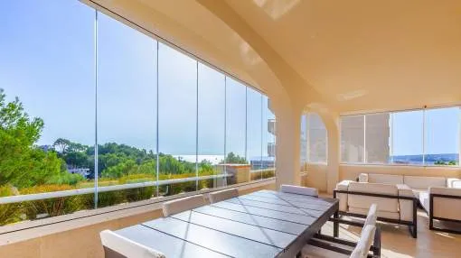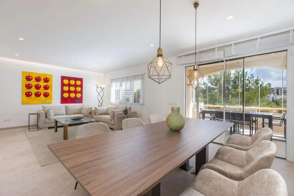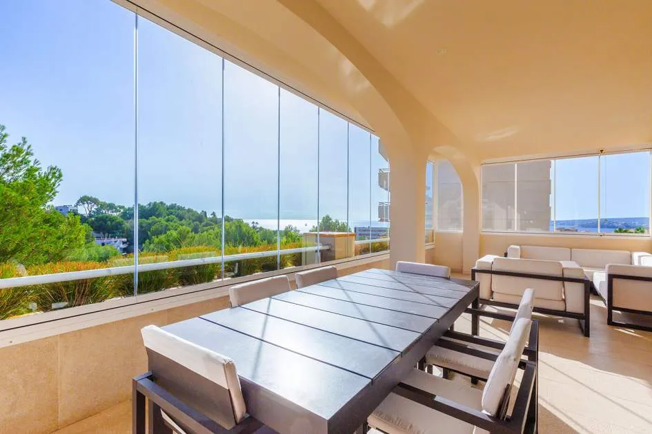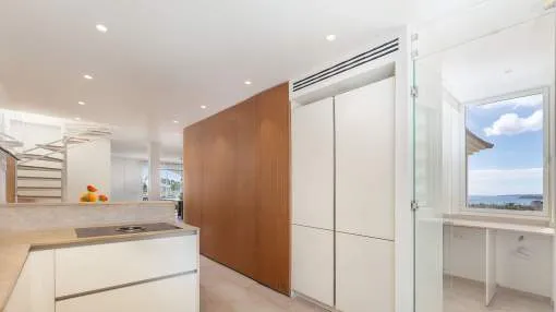 Dieses hochwertig renovierte und elegant ausgestattetes Penthaus befindet sich in einer kleinen Apartmentanlage im mediterranen Stil mit nur sechs Wohneinheiten in zentrumsnaher Wohnlage. Auf kurzem Fußweg erreicht man das Ortszentrum von Portals Nous sowie den exklusiven Hafen Puerto Portals mit angrenzendem Sandstrand. Mehrere Golfplätze, schöne Strände sowie die Küstenorte mit allen Annehmlichkeiten und weitere Yachthäfen des Südwestens sind nur wenige Fahrminuten entfernt. Des Weiteren bietet das luxuriöse Duplex-Apartment eine geräumige überdachte Meerblick-Terrasse auf der Eingangsebene sowie eine 85 m² große Sonnenterrasse mit Pergola, BBQ-Bereich, Lounge, angrenzendem Schlafzimmer mit Ankleide und Bad sowie einem sensationellem Meer- und Panoramablick.