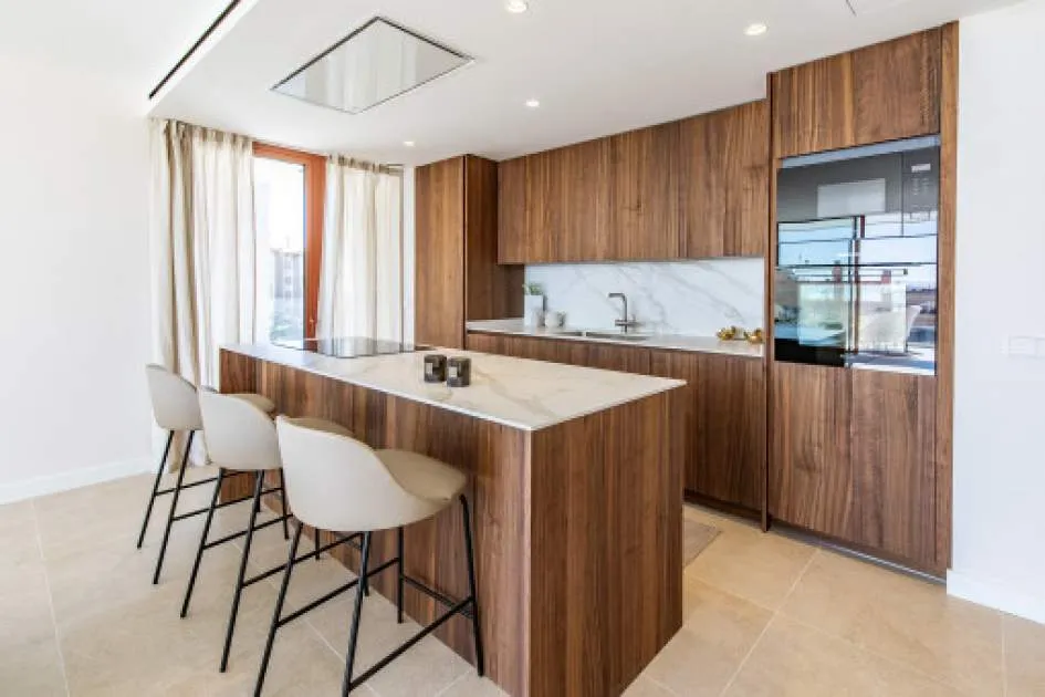 Dieses luxuriöse Neubau Penthouse mit einer Konstruktionsinnenfläche von 123 qm verfügt über 3 Schlafzimmer, 2 Badezimmer, eines davon en Suite, ein separates Gäste-WC, sowie einen großzügigen Wohn-/Essbereich mit offener Küche.