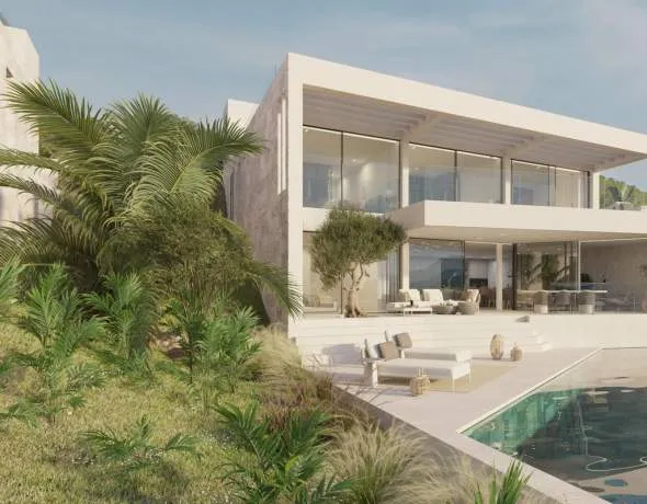 Dieses architektonische Meisterwerk thront hoch oben auf einem erhöhten Hügelgrundstück und bietet einen faszinierenden Panoramablick auf das Meer und die Berge. Die Immobilie, deren Fertigstellung für 2026 geplant ist, verfügt über ein offenes, modernes Design mit einem Kamin und raumhohen Schiebetüren, die Zugang zu den weitläufigen Terrassen und dem großzügigen Infinity-Pool bieten.