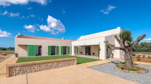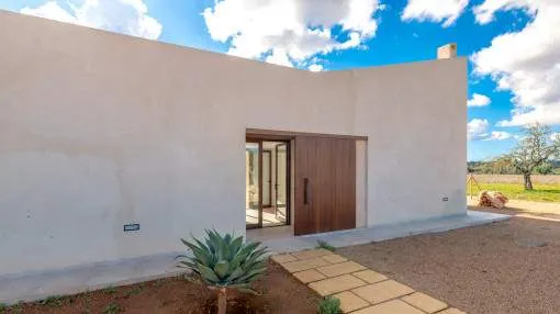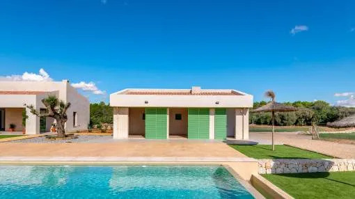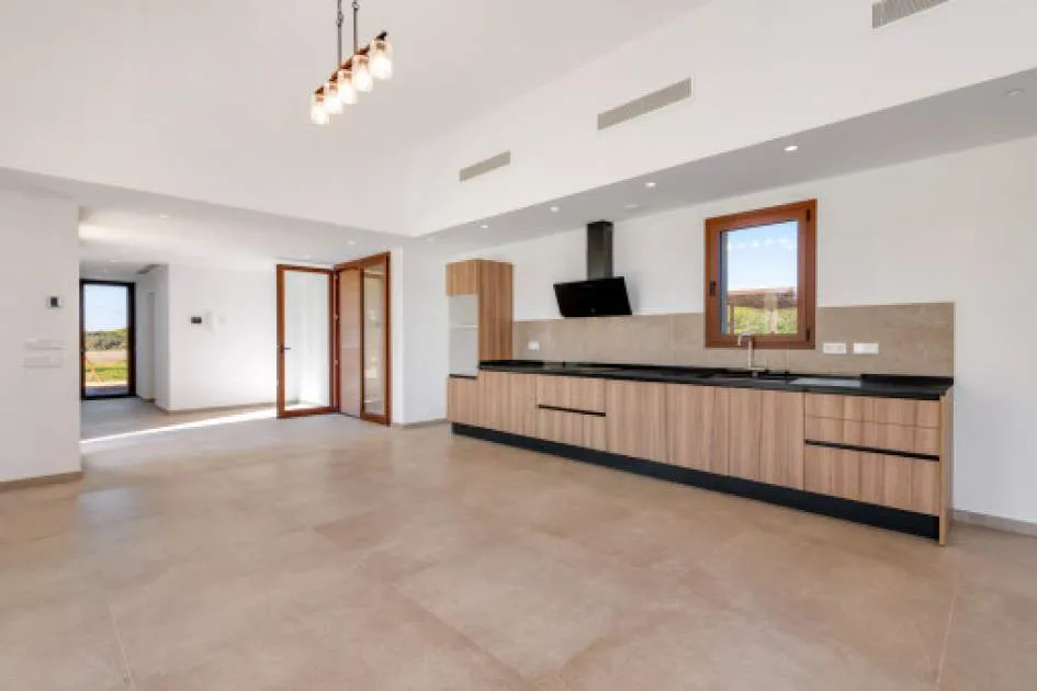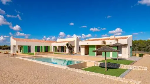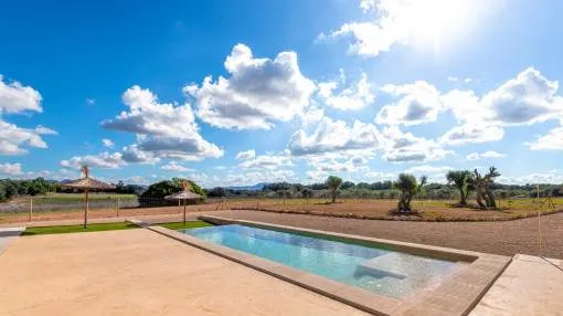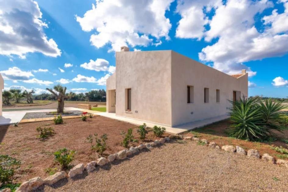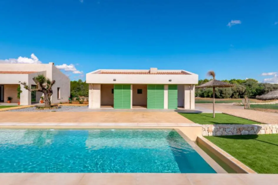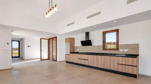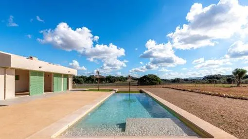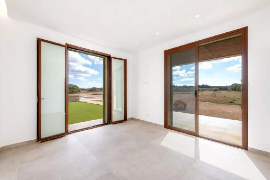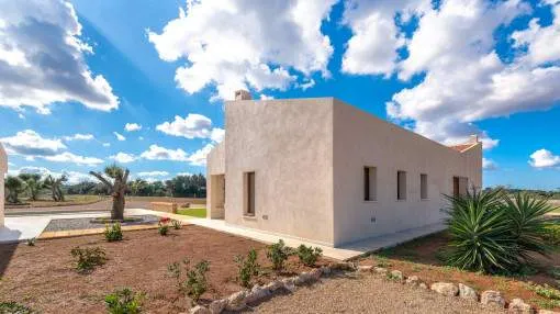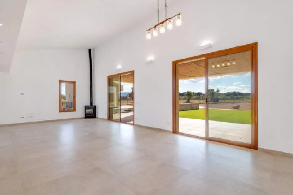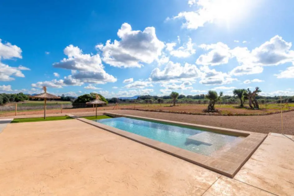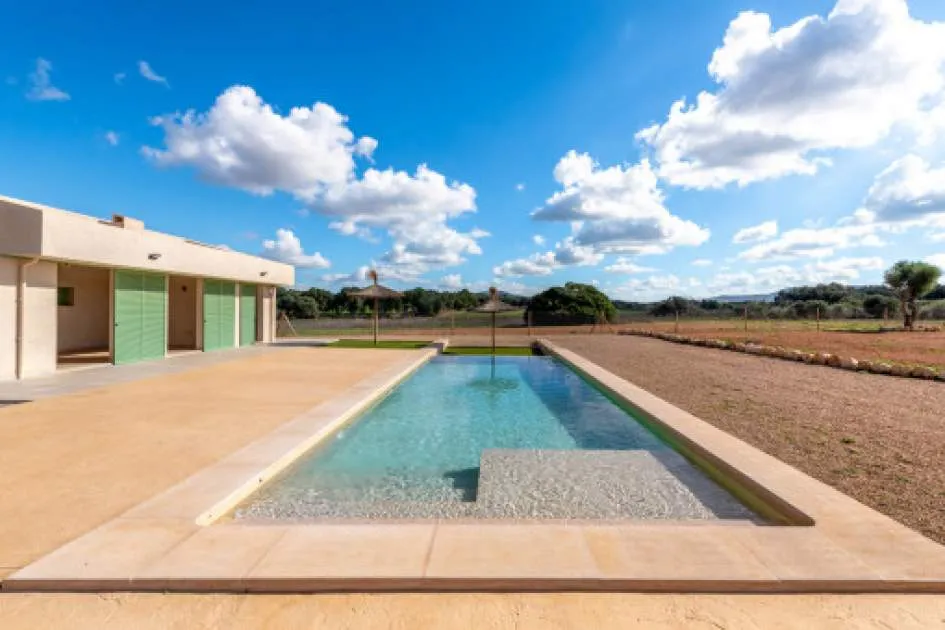 Objektbeschreibung: Diese moderne Neubaufinca befindet sich im Südosten Mallorcas, nur etwa 15 Minuten von Campos entfernt, und bietet absolute Privatsphäre inmitten unberührter Natur. Von der Finca aus genießt man einen traumhaften Panoramablick über die weite Landschaft bis hin zum bekannten Klosterberg San Salvador. Die Umgebung ist ideal für Naturliebhaber und Ruhesuchende – zahlreiche Wanderwege führen durch die abwechslungsreiche Landschaft, unter anderem zu einem Talaiot-Dorf ganz in der Nähe. Das vollständig eingezäunte Grundstück von ca. 4.000 qm bietet Ruhe und Sicherheit und ermöglicht zudem die Nutzung angrenzender Grünflächen, zum Beispiel zur Pferdehaltung. Das Haus verfügt über einen großzügigen Wohnbereich mit offener Küche und Kamin, 4 Schlafzimmer und 3 Badezimmer, eines davon en Suite. Ausgestattet ist die Finca mit Fußbodenheizung über Wärmepumpe und zentralisierter Klimaanlage. Sie wird unmöbliert vermietet. Im Außenbereich befindet sich ein großer Salzwasserpool (12 x 5 m) mit einem charmanten Poolhaus, das über eine Außenküche, einen Barbecue-Bereich und ein Badezimmer verfügt – ideal für entspannte Stunden im Freien. Zwei überdachte Stellplätze stehen zur Verfügung, mit der Möglichkeit, einen Anschluss für Elektrofahrzeuge zu installieren. Die Finca wird ausschließlich zur Langzeitmiete angeboten, mit einer Mindestmietdauer von 12 Monaten. Die Kaution beträgt 3 Monatsmieten. Diese außergewöhnliche Immobilie vereint modernen Wohnkomfort mit mediterranem Lebensgefühl und bietet den perfekten Rückzugsort für alle, die Ruhe, Natur und Privatsphäre suchen. Lage & Umgebung: Das Landstädtchen Campos im Südosten der Insel liegt verkehrstechnisch günstig auf halbem Weg zwischen Llucmajor und Santanyí. Umgeben von weitläufigen, landwirtschaftlich genutzten Flächen bietet es zahlreiche Geschäfte für den täglichen Bedarf, Restaurants und Sporteinrichtungen. Von dem schon seit dem Mittelalter bestehenden Ort stehen heute nur noch einige Wehrtürme, heutzutage ist Campos eine lebendige Kleinstadt, die vor allem an den Markttagen zahlreiche Besucher anlockt. Der berühmte, lange Sandstrand von Es Trenc mit seinen Dünen und türkisblauem Meer gehört zur Gemeinde Campos und bietet Badefreuden mit karibischem Flair. Den Flughafen erreichen Sie in 25 Minuten, die Inselhauptstadt Palma liegt rund 35 km entfernt.