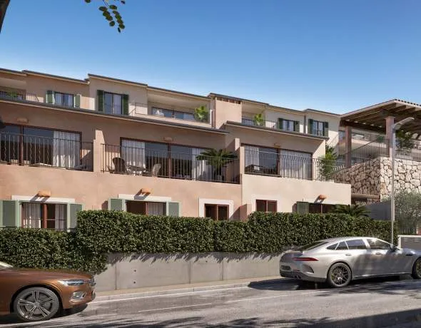 Modern und doch mallorquin gehalten werden am Stadtrand 23 Neubauwohnungen und neun Stadthäuser entstehen. Die Anlage wird über einen Gemeinschaftspool und einen Garten verfügen und bietet genug Parkplätze für alle.