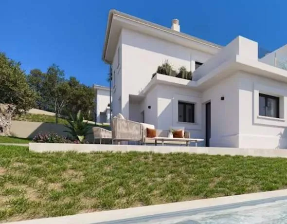 Die Villa mit 4 Schlafzimmern ist freistehend und hat 150 m2 bebaute Fläche plus Terrassen und ein privater Garten.