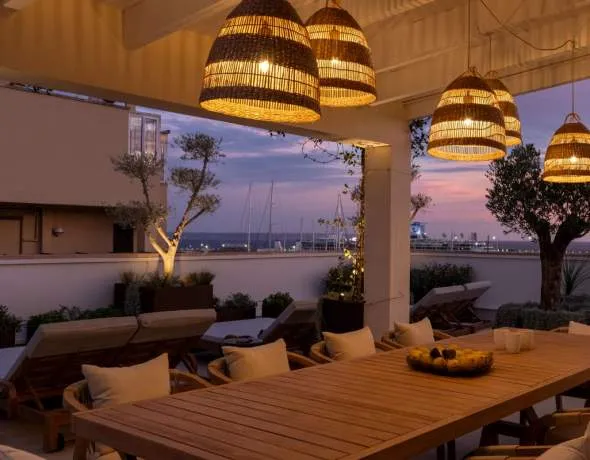Die Dachterrasse ist über die gemeinschaftliche Innentreppe mit einer privaten Zugangstür nur für dieses Penthouse erreichbar. Die Terrasse bietet einen großzügigen Außenbereich mit Dusche und vielen Pflanzen, die der Gärtner leicht pflegen kann, ohne Ihre Privatsphäre zu stören. Ideal zum Essen im Freien, Sonnenbaden oder Entspannen mit Panoramablick auf Yachten und Stadt – diese Wohnung vereint beste Lage, modernen Komfort und einen unschlagbaren Lebensstil am Wasser.