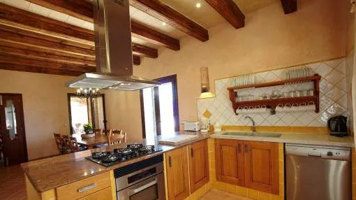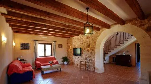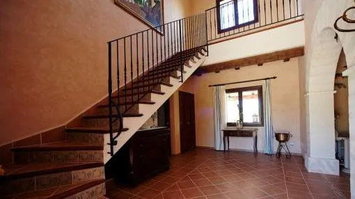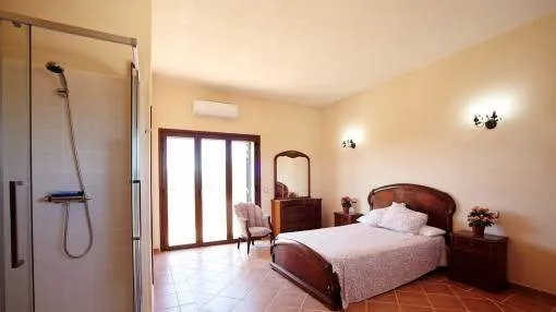Details: In an idyllic location near Santanyí, surrounded by nature and just a few minutes away from beautiful sandy bays, this exclusive finca is the perfect retreat. Absolute tranquillity, plenty of privacy and luxurious living comfort characterize this property. The existing vacation rental license allows use for up to 10 guests and also makes the property extremely attractive from an economic point of view. The spacious plot of around 14,000 m² accommodates a house with approx. 280 m² of living space and a total of around 425 m² of usable space. The heart of the house is the spacious living area, which is accessible via the entrance hall and creates a warm, inviting atmosphere. Adjacent to this is the spacious, fully equipped kitchen with integrated dining area - ideal for those who value cooking and enjoying meals together. There are a total of 5 bedrooms on the first floor, including 4 with double beds and a further room with a single bed. All bedrooms are equipped with air conditioning and large fitted wardrobes. The underfloor heating installed throughout the house provides additional comfort. The upper floor is reserved for the largest bedroom. This has an en-suite bathroom, air conditioning and a private balcony with impressive panoramic views of the surrounding area. The layout over 2 levels guarantees a high degree of privacy. The outdoor area leaves nothing to be desired: A spacious swimming pool measuring approximately 7 x 12 meters invites you to relax, swim and linger. There is a large, covered terrace right next to the house as well as an additional bathroom with shower and WC. Around the pool, a covered lounge and several parasols provide pleasant shade on warm days. The water supply is provided by both a private well and the public network. Returns from holiday lettings: For initial orientation you can use the “Porta Holiday Returns Calculator” without obligation to calculate your potential returns from holiday letting. NB: Due to the current legal situation it is possible that in certain municipalities renting restrictions may apply, or new touristic licences may not be granted. Your Porta Mallorquina real estate consultant will be pleased to advise you whether the property you have chosen is affected. Go to Returns Calculator. Location & surrounding area: Santanyí is located in the attractive southeast of Mallorca and is known for its authentic Mallorcan charm. The town features traditional architecture, a popular weekly market and a wide selection of restaurants, cafés and boutiques. Numerous beautiful coves and sandy beaches such as Cala Santanyí, Cala Llombards and the Mondragó Natural Park are nearby. Palma Airport can be reached in approximately 45 minutes. Santanyí combines tranquillity, nature and Mediterranean lifestyle in one of the island’s most sought-after areas.