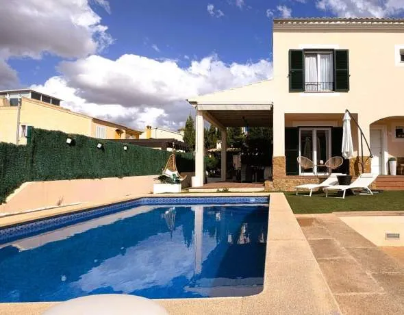 Dieses gemütliche Haus befindet sich in einer kleinen Gemeinschaftsanlage in Sa Torre. Die Anlage besteht aus insgesamt nur 27 Reihenhäusern und ist sehr gepflegt. Das Haus ist aufgeteilt auf zwei Ebenen. Im Erdgeschoss finden Sie neben einem Gästebad, die Küche und den offenen Wohn/ Essbereich. Durch die bodentiefen Fenster haben Sie aus jedem Zimmer Zugang zum Garten und den verschiedenen Terrassen. Da es sich um ein Eckhaus handelt, ist das Haus auf drei Seiten von dem grosszügigen privaten Garten mit Pool umgeben.   Im Obergeschoss finden Sie zwei Kinderzimmer, die sich ein Badezimmer teilen, und das Masterschlafzimmer mit Ankleide und Bad en suite. Das Haus wurde liebevoll von den jetzigen Eigentümern renoviert und weist keinen Renovierungsstau auf. Es verfügt zudem über eine Zentralheizung und eine Parkmöglichkeit auf dem eigenen Grundstück.