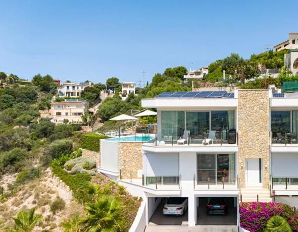Atemberaubende Panoramablicke auf das Meer sowie reichlich Tageslicht schaffen eine helle, offene und einladende Atmosphäre im gesamten Haus. Die gesamte Immobilie ist mit Klimaanlage w/k, sowie Fußbodenheizung ausgestattet und verfügt des Weiteren über eine Solaranlage mit Batteriespeicher und komplett automatische Außenbeschattung der Fenster. Ein hochmodernes Domotik-System ermöglicht die komfortable Steuerung von Beleuchtung, Klima und weiteren Funktionen und sorgt so für höchsten Wohnkomfort und Effizienz.