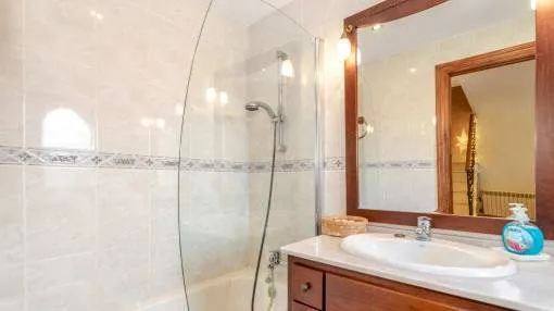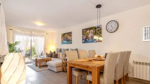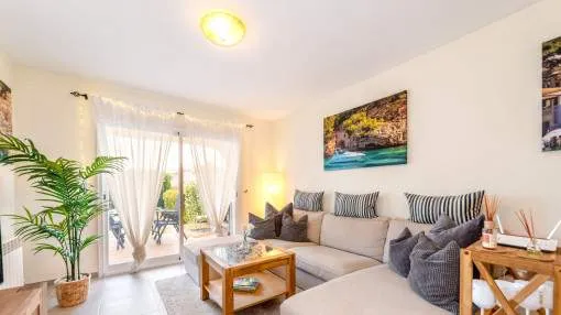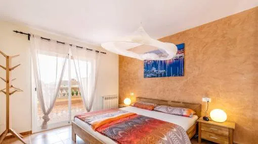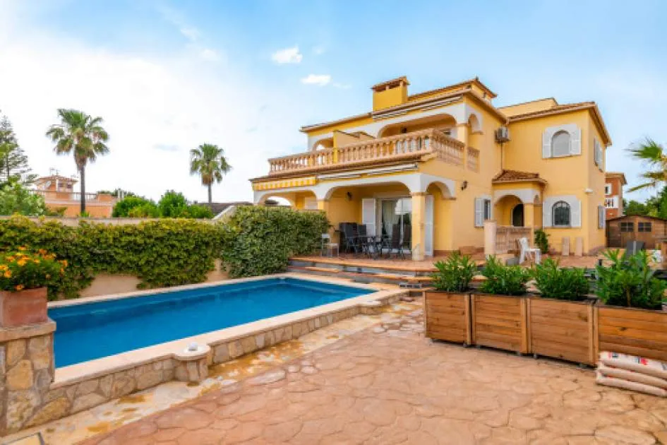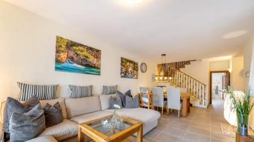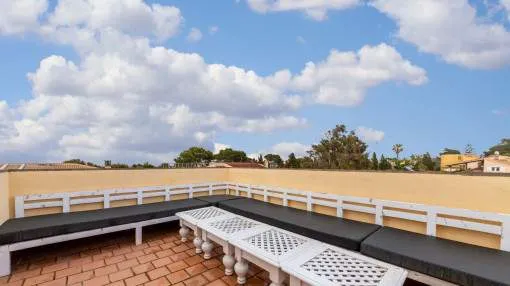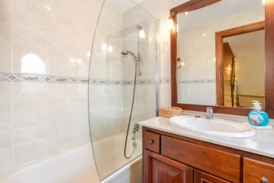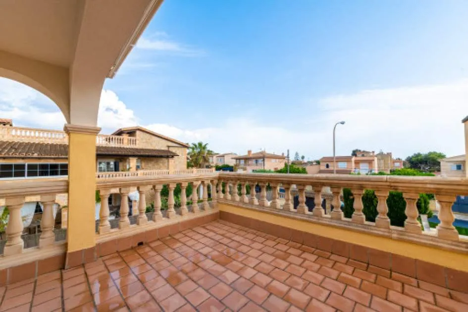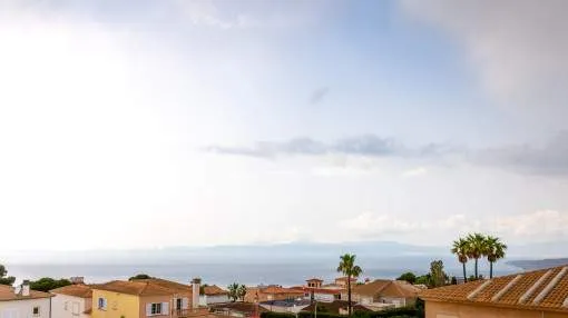 Objektbeschreibung: Sehr schöne und gepflegte Doppelhaushälfte mit Pool in dem Küstenort Bahia Azul. Auf insgesamt 186 qm verteilt auf 2 Stockwerke, gibt es 3 Schlafzimmer und 3 Badezimmer, eines davon en Suite. Beim Betreten des Hauses gelangt man durch die Garderobe in den offenen Wohnbereich mit Ausgang zur Terrasse, der separaten Küche oder ein Schlafzimmer mit dazugehörigem Badezimmer. Im Obergeschoss befinden sich das Hauptschlafzimmer mit Badezimmer en Suite und ein großer Balkon, sowie ein weiteres Schlafzimmer mit separatem Badezimmer. Es gibt auch eine Dachterrasse mit Meerblick über die ganze Bucht von Palma bis ins Tramuntana Gebirge. Zur weiteren Ausstattung gehören Klimageräte in den Schlafzimmern, Zentralheizung und ein Pool mit 21 qm, der mit Chlor betrieben wird. Die Gartenanlage wird gerade neu gestaltet und die Terrasse geöffnet. Ein perfektes pflegeleichtes Feriendomizil in guter Lage. Zum nächsten Sandstrand sind es 5 Minuten, zum Flughafen 10 Min. und nach Palma sind es ca. 20 Autominuten. Rendite aus Ferienvermietung: Mit dem „Porta Holiday Renditerechner“ können Sie zur ersten Orientierung unverbindlich Ihre potenziellen Einnahmen aus einer möglichen Ferienvermietung berechnen. Hinweis: Aufgrund der aktuellen Gesetzeslage kann es in bestimmten Gemeinden zu einer Beschränkung der Vermietbarkeit kommen bzw. werden keine neuen touristischen Lizenzen mehr vergeben. Ihr Porta Mallorquina Immobilienberater berät Sie gerne, ob die von Ihnen gewählte Immobilie davon betroffen ist. Hier geht’s zum Renditerechner. Lage & Umgebung: Bahía Azul liegt am östlichen Ende der Bucht von Palma. Es handelt sich hierbei um ein ruhiges Wohngebiet, welches hauptsächlich aus Villen besteht. Es liegt an einer Felsküste, besitzt eine gute Infrastruktur, und innerhalb von 15 min. erreicht man den Flughafen und die Stadt Palma.