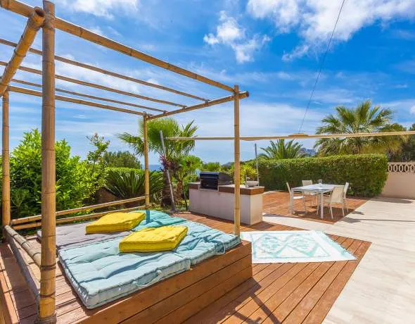 Das lichte Apartment befindet sich in einer exklusiven Urbanisation nur ca. 20 Kilometer von Palma entfernt und ist Teil einer kleinen Residenz mit nur acht Wohneinheiten. Sie verfügt über einen schönen Gemeinschaftsbereich mit Swimmingpool und Sonnenterrasse sowie PKW-Stellplätze. Die Wohnlage in 2. Meereslinie bietet viel Ruhe und Grünflächen. Nicht weit entfernt liegt der bezaubernde Strand von Cala Vinyas und in zwei nahegelegenen Badeorten gibt es große Sandstrände und eine gute Infrastruktur. Das südostorientierte Apartment wurde 2019 grundsaniert und modern ausgestattet. Die Wohnfläche teilt sich auf in das Wohn-/Esszimmer, eine voll ausgestattetet Küche, drei Schlafzimmer und zwei Bäder, eines davon en suite. Eine großzügige überdachte Terrasse wurde in den Wohnbereich integriert und in einen gemütlichen Wintergarten umgebaut, der sich mittels deckenhoher Glaselemente zum Außenbereich hin komplett öffnen lässt. Von der großen Sonnenterrasse mit Barbecue, Lounge und Sonnensegel hat man Blick aufs Meer.