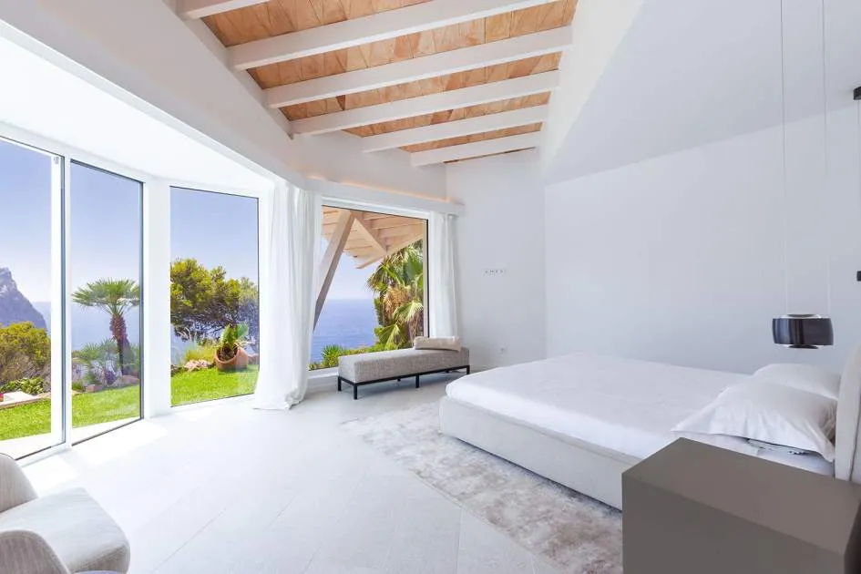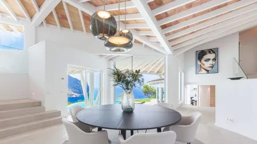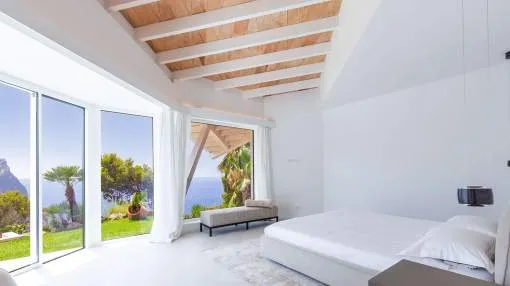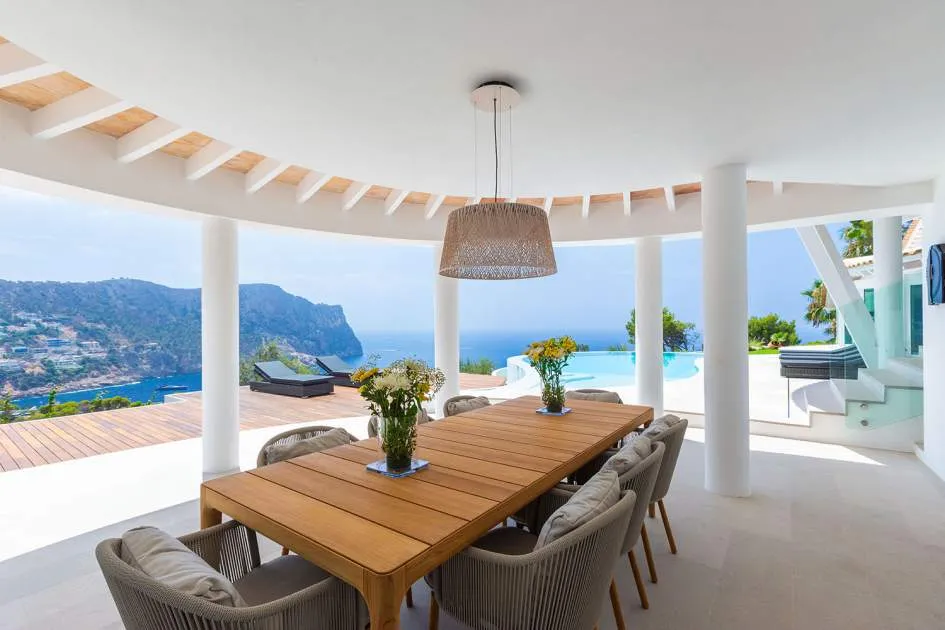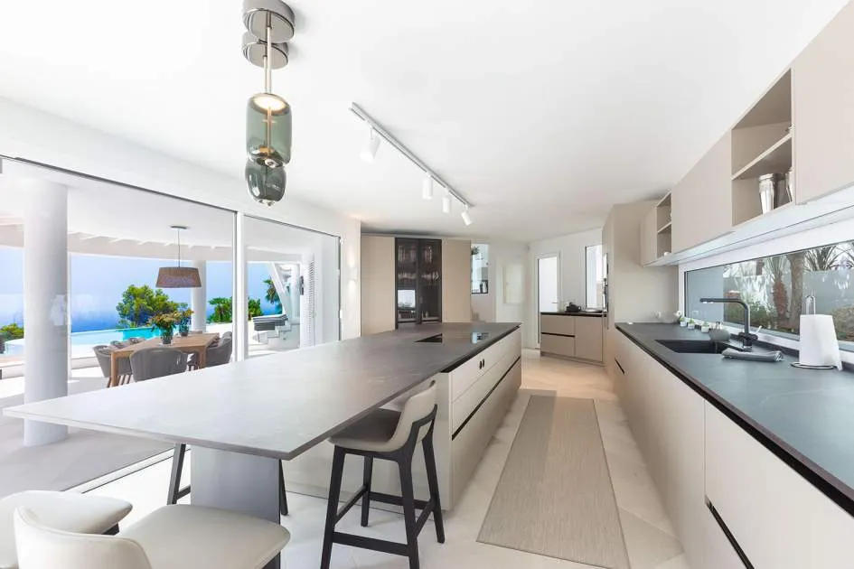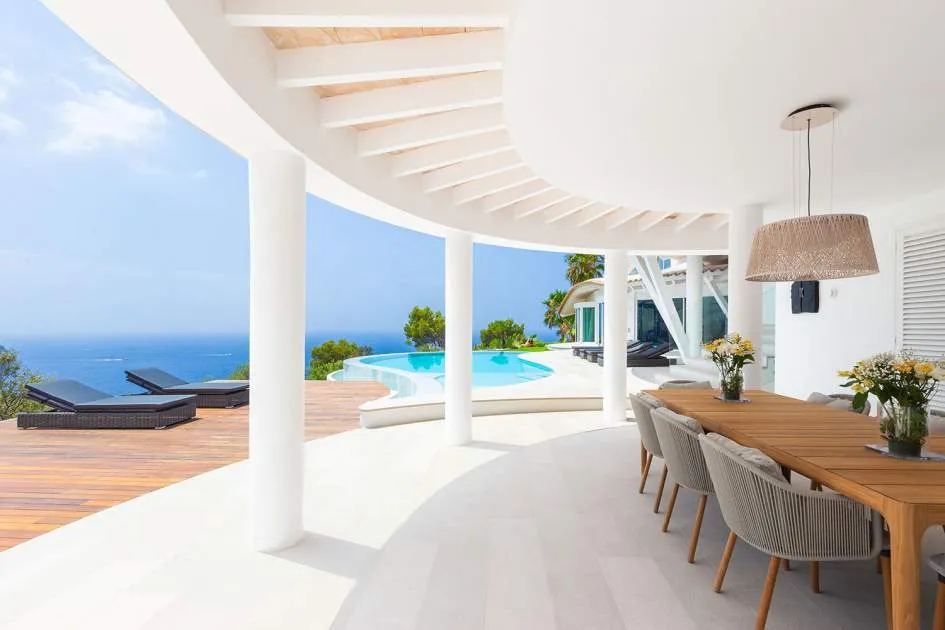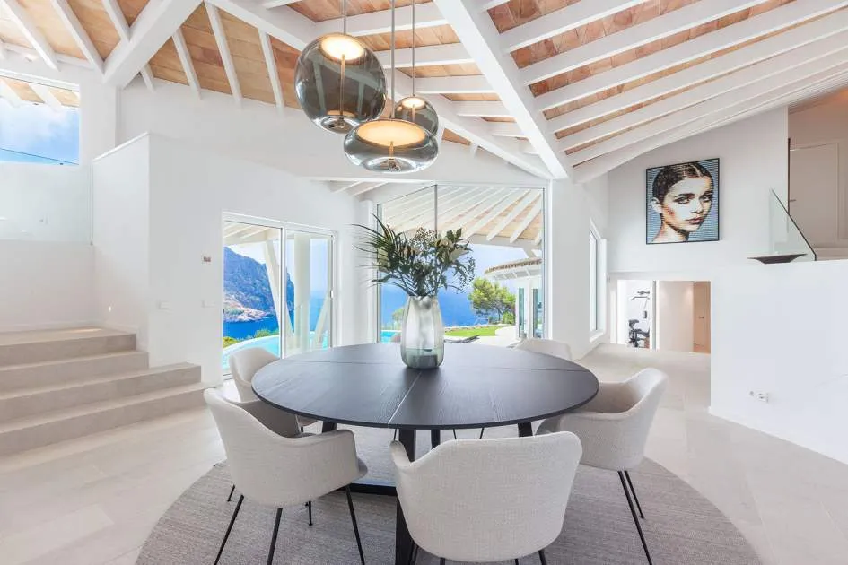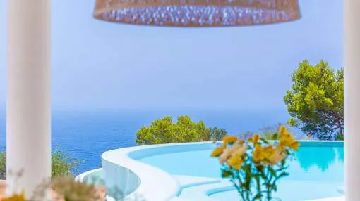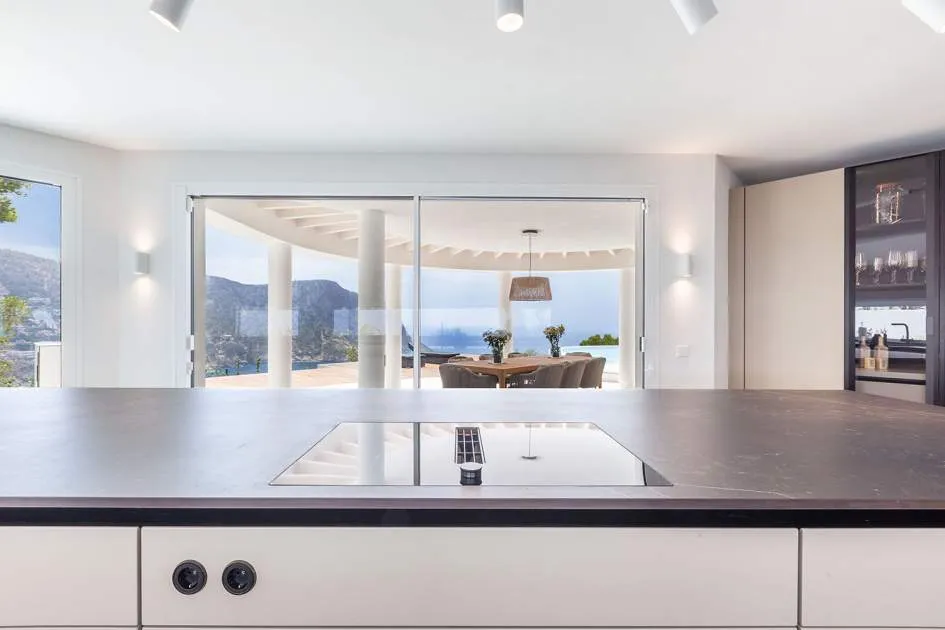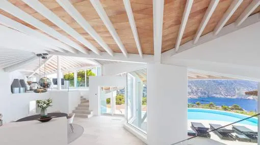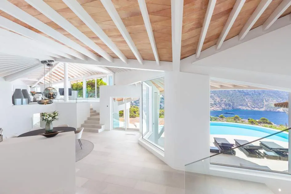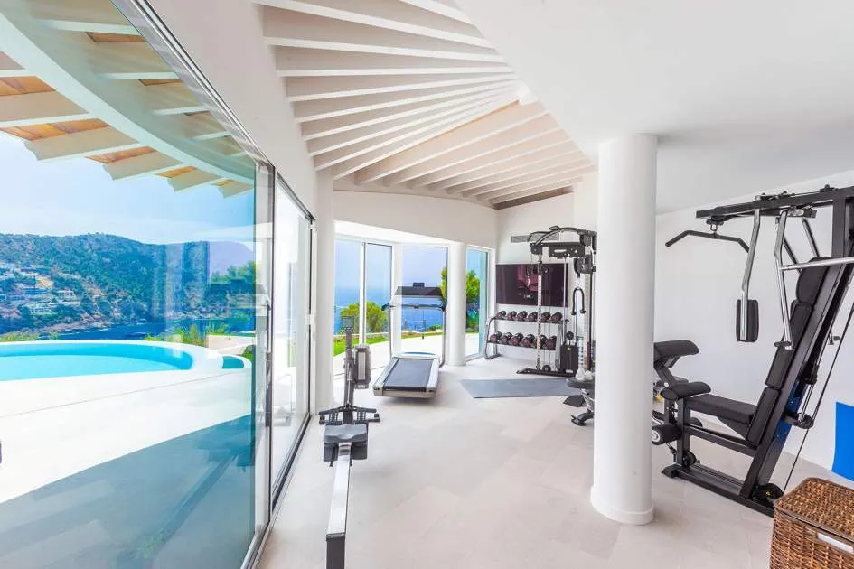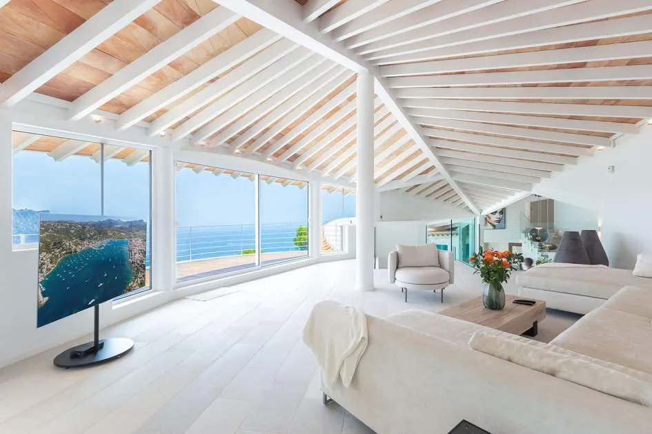 Diese außergewöhnliche Luxusvilla ist das Projekt des südamerikanischen Architekten Alberto Rubio, welches durch die geschwungenen Dächer mit interessanten Balkenkonstruktionen und durch die Großzügigkeit der Innen- und Außenbereiche besticht. Lichtdurchflutete Räume mit sehr hohen Decken lassen ein einzigartiges Ambiente entstehen. Auf versetzten Ebenen bietet dieses Luxusanwesen einen beeindruckenden, hellen Wohnbereich mit einem Wohnzimmer, einem Esszimmer, einer modernen Küche, zwei große Schlafzimmer mit Bädern en Suite, drei weitere Schlafzimmer mit eigenen Bädern und einen Fitnessbereich mit fantastischem Blick auf den Pool und das offene Meer. Die Villa fügt sich perfekt ein in das gärtnerisch aufwendig angelegte und automatisch bewässerte Terrain in bevorzugter Villenlage oberhalb der Cala Marmacén, bietet ganztags Sonne sowie einen traumhaften 180°-Blick hinweg aufs offene Meer. Des Weiteren bietet es großzügige freie und überdachte Terrassen mit einem integrierten Infinity-Swimmingpool, einen Barbecue-Bereich mit Sommerküche sowie eine große Doppelgarage. Die Villa verfügt über eine Ferienvermietungslizenz und wurde 2023 einer umfassenden Renovierung unterzogen.