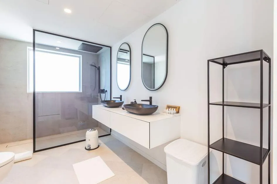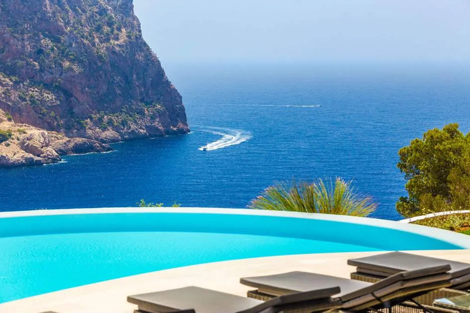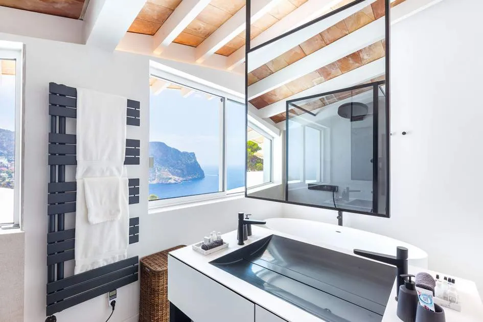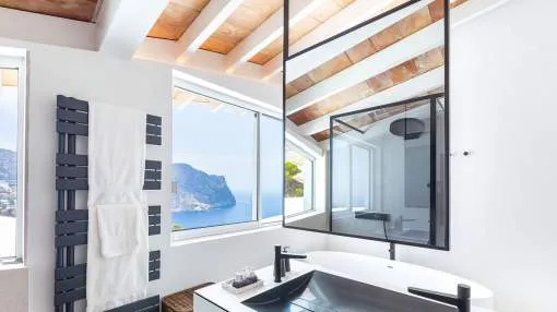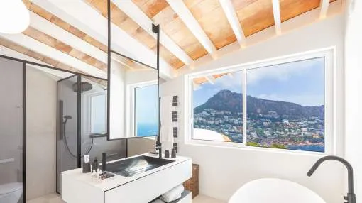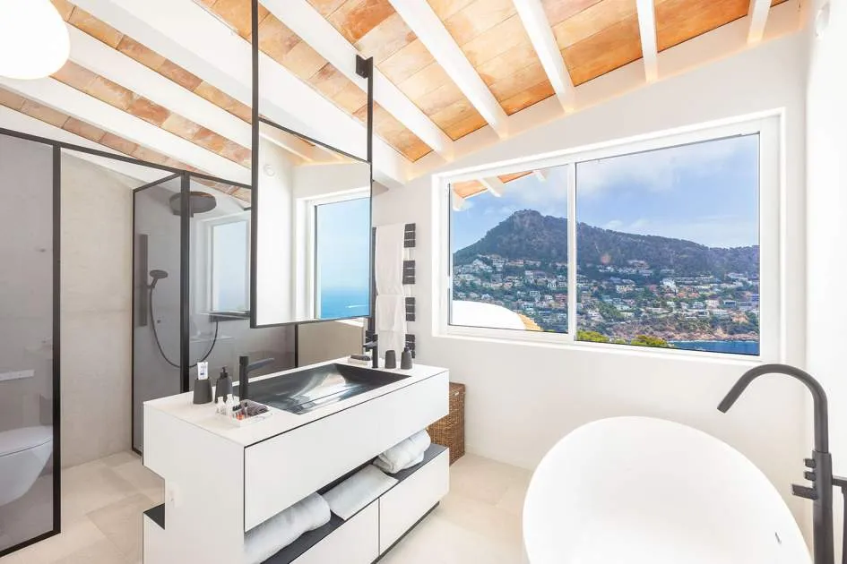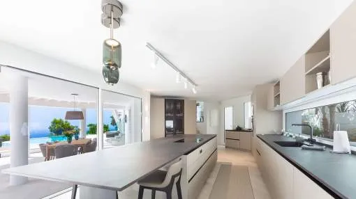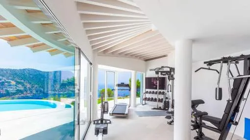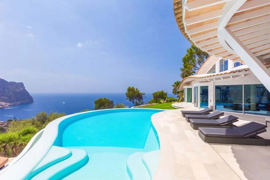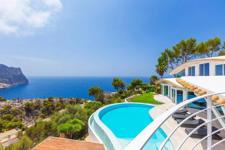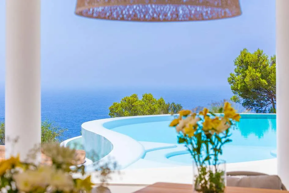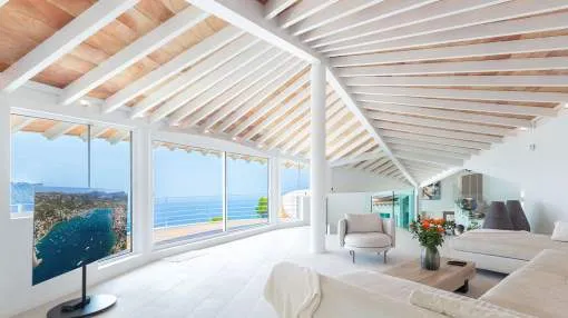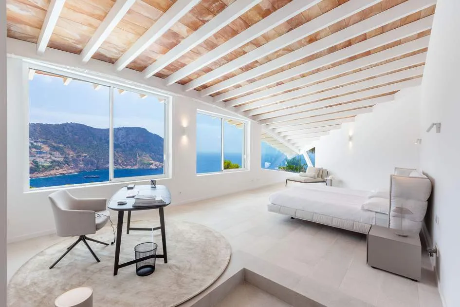 Diese außergewöhnliche Luxusvilla ist das Projekt des südamerikanischen Architekten Alberto Rubio, welches durch die geschwungenen Dächer mit interessanten Balkenkonstruktionen und durch die Großzügigkeit der Innen- und Außenbereiche besticht. Lichtdurchflutete Räume mit sehr hohen Decken lassen ein einzigartiges Ambiente entstehen. Auf versetzten Ebenen bietet dieses Luxusanwesen einen beeindruckenden, hellen Wohnbereich mit einem Wohnzimmer, einem Esszimmer, einer modernen Küche, zwei große Schlafzimmer mit Bädern en Suite, drei weitere Schlafzimmer mit eigenen Bädern und einen Fitnessbereich mit fantastischem Blick auf den Pool und das offene Meer. Die Villa fügt sich perfekt ein in das gärtnerisch aufwendig angelegte und automatisch bewässerte Terrain in bevorzugter Villenlage oberhalb der Cala Marmacén, bietet ganztags Sonne sowie einen traumhaften 180°-Blick hinweg aufs offene Meer. Des Weiteren bietet es großzügige freie und überdachte Terrassen mit einem integrierten Infinity-Swimmingpool, einen Barbecue-Bereich mit Sommerküche sowie eine große Doppelgarage. Die Villa verfügt über eine Ferienvermietungslizenz und wurde 2023 einer umfassenden Renovierung unterzogen.