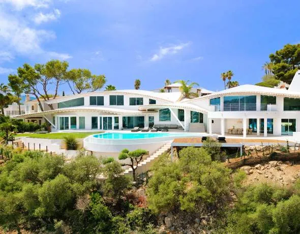 Diese außergewöhnliche Luxusvilla ist das Projekt des südamerikanischen Architekten Alberto Rubio, welches durch die geschwungenen Dächer mit interessanten Balkenkonstruktionen und durch die Großzügigkeit der Innen- und Außenbereiche besticht. Lichtdurchflutete Räume mit sehr hohen Decken lassen ein einzigartiges Ambiente entstehen. Auf versetzten Ebenen bietet dieses Luxusanwesen einen beeindruckenden, hellen Wohnbereich mit einem Wohnzimmer, einem Esszimmer, einer modernen Küche, zwei große Schlafzimmer mit Bädern en Suite, drei weitere Schlafzimmer mit eigenen Bädern und einen Fitnessbereich mit fantastischem Blick auf den Pool und das offene Meer. Die Villa fügt sich perfekt ein in das gärtnerisch aufwendig angelegte und automatisch bewässerte Terrain in bevorzugter Villenlage oberhalb der Cala Marmacén, bietet ganztags Sonne sowie einen traumhaften 180°-Blick hinweg aufs offene Meer. Des Weiteren bietet es großzügige freie und überdachte Terrassen mit einem integrierten Infinity-Swimmingpool, einen Barbecue-Bereich mit Sommerküche sowie eine große Doppelgarage. Die Villa verfügt über eine Ferienvermietungslizenz und wurde 2023 einer umfassenden Renovierung unterzogen.