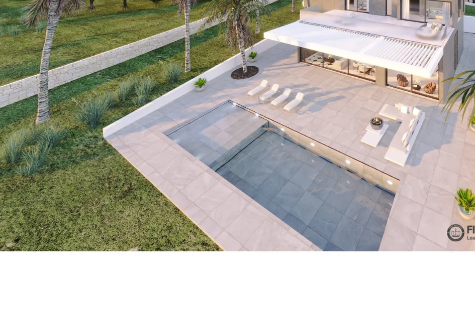 Im Außenbereich lädt der nach Süden ausgerichtete Pool von 43 m² mit Gartenbereich zu entspannenden Momenten im Freien ein. Im Keller befinden sich eine Garage für zwei oder mehr Autos sowie Abstellfläche.