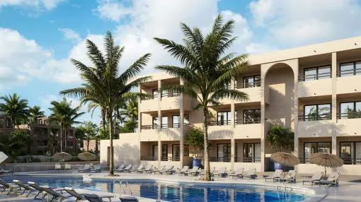 Dieser hochwertig renovierte Aparthotelkomplex mit insgesamt 115 Einheiten liegt im idyllischen Portocolom an der begehrten Südostküste Mallorcas – nur wenige Gehminuten vom Meer entfernt. Die Anlage vereint zeitgemäßes Design mit durchdachter Funktionalität und einem hohen Maß an Wohnkomfort. Angeboten werden verschiedene Einheitstypen, darunter Studios sowie Apartments mit einem oder zwei Schlafzimmern. Alle Wohneinheiten sind vollständig möbliert, verfügen über moderne, voll ausgestattete Küchen und private Terrassen.