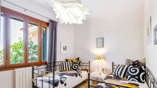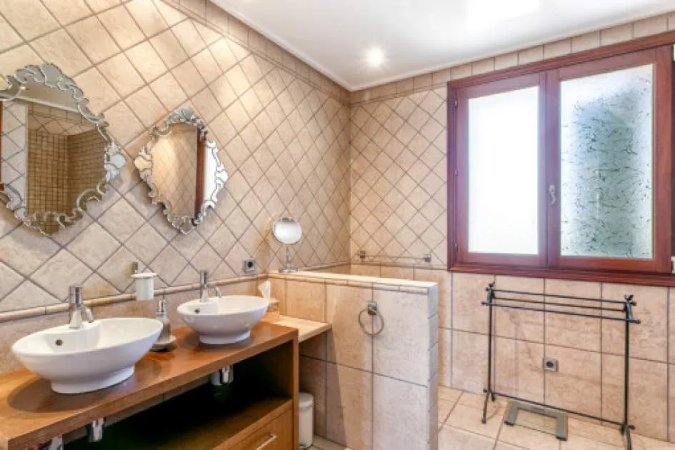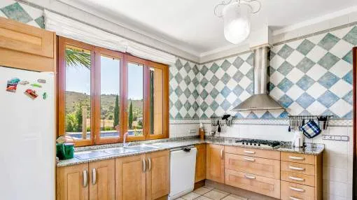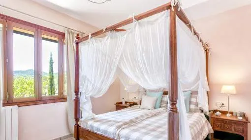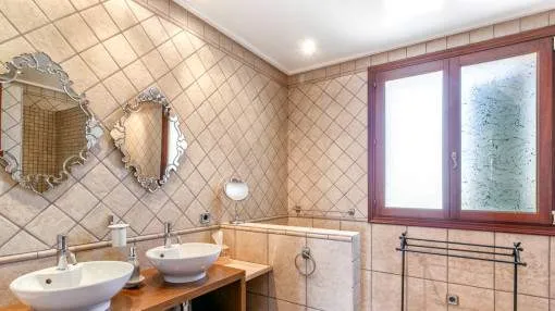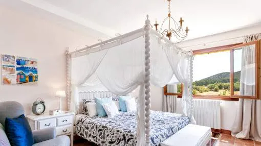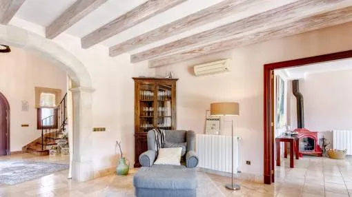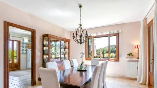Objektbeschreibung: Das Anwesen ist von Palmen und Obstbäumen umgeben und liegt zwischen Manacor (6 km) und der Ostküste Mallorcas. Es befindet sich in einer wunderschönen, hügeligen Landschaft, ganz in der Nähe der berühmten Rafa Nadal Academy. Die stilvolle Natursteinfinca fügt sich harmonisch in die Umgebung ein und bietet ideale Voraussetzungen, um das mediterrane Leben auf Mallorca zu genießen. Hinter der zweiflügeligen Eingangstür befindet sich die hohe Eingangshalle mit offener Treppe ins Obergeschoss. Von hier aus gelangt man in den großzügigen Salon mit Zugang zum Esszimmer mit Kaminofen und zur voll ausgestatteten Einbauküche. Außerdem befinden sich in dieser Etage zwei Schlafzimmer und ein Badezimmer. Im Obergeschoss liegen zwei weitere Schlafzimmer mit Ankleidezimmern und zwei Badezimmern, eines davon en Suite. Die große, überdachte Terrasse ist direkt von den Räumen im Erdgeschoss erreichbar und umgibt das Haus auf der Süd- und Westseite. Der 13 x 6 m große Pool wird von Palmen und eleganten Säulen eingerahmt – perfekt zum Entspannen in privater Atmosphäre. Die Finca ist ausgestattet mit Klimaanlage (warm/kalt), Ölzentralheizung, Sat-TV und Alarmanlage. Die Pflege von Pool und Garten ist im Mietpreis bereits enthalten – ideal für alle, die ein komfortables Zuhause auf Mallorca mit Pool, Charme und Nähe zur Rafa Nadal Academy suchen. Lage & Umgebung: Manacor ist die zweitgrößte Stadt Mallorcas und ein lebendiges Zentrum im Osten der Insel. Sie verbindet Tradition mit moderner Infrastruktur und bietet zahlreiche Einkaufsmöglichkeiten, Restaurants, Cafés und Schulen. Bekannt ist Manacor für seine Möbelproduktion, die weltberühmte Perlenmanufaktur Majorica und die renommierte Rafa Nadal Academy, die Besucher aus aller Welt anzieht. Die Stadt gilt als familienfreundlich und pflegt ihre Traditionen mit Festen wie den Patronatsfeiern zu Sant Antoni im Januar oder der Fira de Manacor im Mai. Rund um die Stadt erstrecken sich idyllische Landstriche mit sanften Hügeln und traditionellen Fincas. Die traumhaften Strände der Ostküste, darunter Cala Anguila, Cala Romántica und Porto Cristo, sind in nur wenigen Fahrminuten erreichbar.