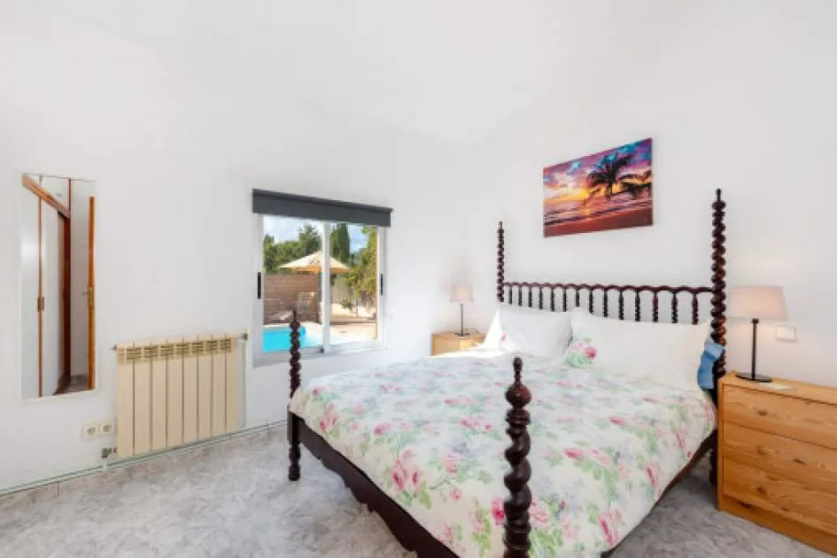 Zur linken Seite öffnet sich der Zugang zur großen Terrasse mit BBQ-Bereich und angrenzendem Pool. Im hinteren Bereich des Hauses befinden sich zwei weitere helle Doppelschlafzimmer mit schöner Raumhöhe und Stauraum. Eines der Schlafzimmer bietet direkten Zugang zur Poolterrasse. Zusätzlich gibt es eine separate Toilette im Heizraum nahe dem Pool.
