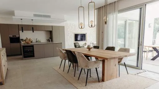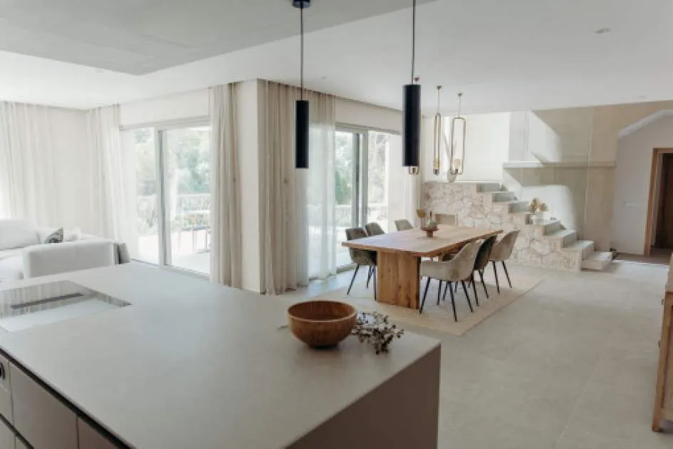 Objektbeschreibung: Diese stilvolle Neubauvilla befindet sich auf einem rund 1.000 qm großen Grundstück in der Nähe von Cala Figuera, dessen malerischer Hafen bequem zu Fuß in 3 Minuten erreichbar ist. Das Grundstück garantiert viel Privatsphäre und eröffnet einen wunderschönen Blick ins Grüne. Die Architektur verbindet moderne Elemente mit traditionellen mallorquinischen Akzenten und schafft ein harmonisches Gesamtbild. Der offen gestaltete Wohn- und Essbereich mit integrierter Küche überzeugt durch klare Linien, die in Kombination mit feinen Sandsteinwänden und warmen Farbtönen eine behagliche Atmosphäre erzeugen. Die geschmackvolle und hochwertige Inneneinrichtung ist durch einen Interior-Designer erfolgt. Großzügige Glasschiebetüren lassen Innen- und Außenbereiche sanft ineinander übergehen. Auf der überdachten Terrasse entsteht ein einladender Sitzbereich. Auf dieser Ebene liegen zudem ein Schlafzimmer mit Bad en Suite sowie ein Gäste-WC. Im ersten Obergeschoss befinden sich 3 weitere Schlafzimmer, jeweils mit eigenem Badezimmer. Zwei der Räume verfügen zusätzlich über Zugang zu einer Terrasse mit Blick in den Garten. Ein besonderes Highlight ist die große Dachterrasse, von der aus sich spektakuläre Sonnenuntergänge bewundern lassen. Im Untergeschoss bietet die Villa einen weitläufigen Keller mit verschiedenen Mehrzweck- und Technikräumen, einem Badezimmer sowie einer Sauna. Der Garten hinter dem Haus ist großzügig angelegt und verfügt über einen Salzwasserpool mit Sonnenterrasse. Mediterrane Bepflanzung sorgt für eine pflegeleichte Wohlfühlatmosphäre. Ein Jacuzzi direkt neben der überdachten Terrasse ergänzt das komfortable Außenangebot. Weitere Ausstattungsmerkmale umfassen Fußbodenheizung, Klimaanlage, Photovoltaikanlage und einen überdachten PKW-Stellplatz. Diese besondere Immobilie vereint modernen Wohnkomfort mit authentischem Inselcharme und bietet den perfekten Rückzugsort für alle, die Ruhe, Stil und die Nähe zum Meer schätzen. Rendite aus Ferienvermietung: Mit dem „Porta Holiday Renditerechner“ können Sie zur ersten Orientierung unverbindlich Ihre potenziellen Einnahmen aus einer möglichen Ferienvermietung berechnen. Hinweis: Aufgrund der aktuellen Gesetzeslage kann es in bestimmten Gemeinden zu einer Beschränkung der Vermietbarkeit kommen bzw. werden keine neuen touristischen Lizenzen mehr vergeben. Ihr Porta Mallorquina Immobilienberater berät Sie gerne, ob die von Ihnen gewählte Immobilie davon betroffen ist. Hier geht’s zum Renditerechner. Lage & Umgebung: Santanyí im Südosten Mallorcas gehört zu den beliebtesten Orten der Insel und hat über die Jahrhunderte schon Römern, Arabern und Piraten getrotzt. Das hübsche Städtchen erhebt sich mit seinen goldfarbenen Sandsteinfassaden aus dem grünen Umland und lockt Urlauber wie Einheimische regelmäßig mittwochs und samstags auf den farbenfrohen Wochenmarkt. Rund um die Plaza Mayor bieten zahlreiche Cafés und Restaurants ein breites kulinarisches Angebot. Die umliegenden kleinen Gassen mit netten Geschäften laden zum Bummeln ein. Für Wanderfans bietet der nahe gelegene Naturpark Mondragó zahlreiche Routen, während Badefans in den idyllischen Buchten der Ostküste wie Cala Santanyí oder Cala Llombarts auf ihre Kosten kommen. Nicht weit entfernt liegen der Hafen von Portocolom und der Golfplatz Vall d´Or.