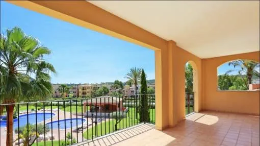 VERFÜGBAR AB 01.12.25 Charmantes Apartment in einer gepflegten Wohnanlage in Santa Ponsa, einer der gefragtesten Wohngegenden mit vollständiger Infrastruktur und vielfältigen Freizeitmöglichkeiten im Südwesten Mallorcas. Die Wohnfläche von ca. 115 m² besteht aus einem Wohnzimmer, einer separaten, voll ausgestatteten Küche mit Hauswirtschaftsraum, 3 Schlafzimmern und 2 Badezimmern (eines en suite). Die Immobilie besticht durch eine großzügige, überdachte Terrasse von ca. 20 m² mit Blick auf den in einen schönen Garten eingebetteten Pool. Sowohl vom Wohnzimmer als auch von der Küche aus gibt es Zugang zur Terrasse. Die Einrichtung eines Lounge- oder Essbereichs ermöglicht es den zukünftigen Mietern, das angenehme mediterrane Klima fast das ganze Jahr über zu genießen. Zur Ausstattung der Wohnung gehören Klimaanlagen und Einbauschränke. Die Immobilie wird unmöbliert vermietet und verfügt über einen Stellplatz. Sehr gute Lage in der Nähe der Golfplätze von Santa Ponsa, nur wenige Gehminuten vom Stadtzentrum und dem Strand mit der Promenade, Restaurants, Geschäften, Supermärkten entfernt. EnergieausweisArt: vorhandenKlasse: G