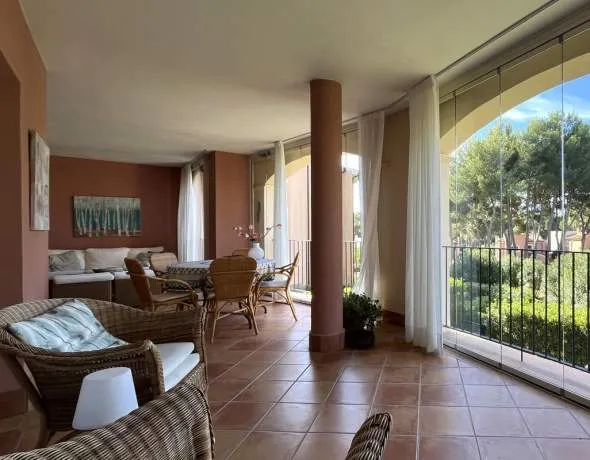 Eine moderne und elegante Zwei-Zimmer-Wohnung mit zwei Bädern und einer sonnigen Terrasse in einer exklusiven geschlossenen Wohnanlage neben Golfplätzen und in Strandnähe. Die Immobilie liegt nur wenige Minuten vom eleganten Yachthafen Port Adriano mit seinen Boutiquen, Cafés und Restaurants entfernt. Die Wohnanlage bietet schöne Gärten und einen großen Swimmingpool.